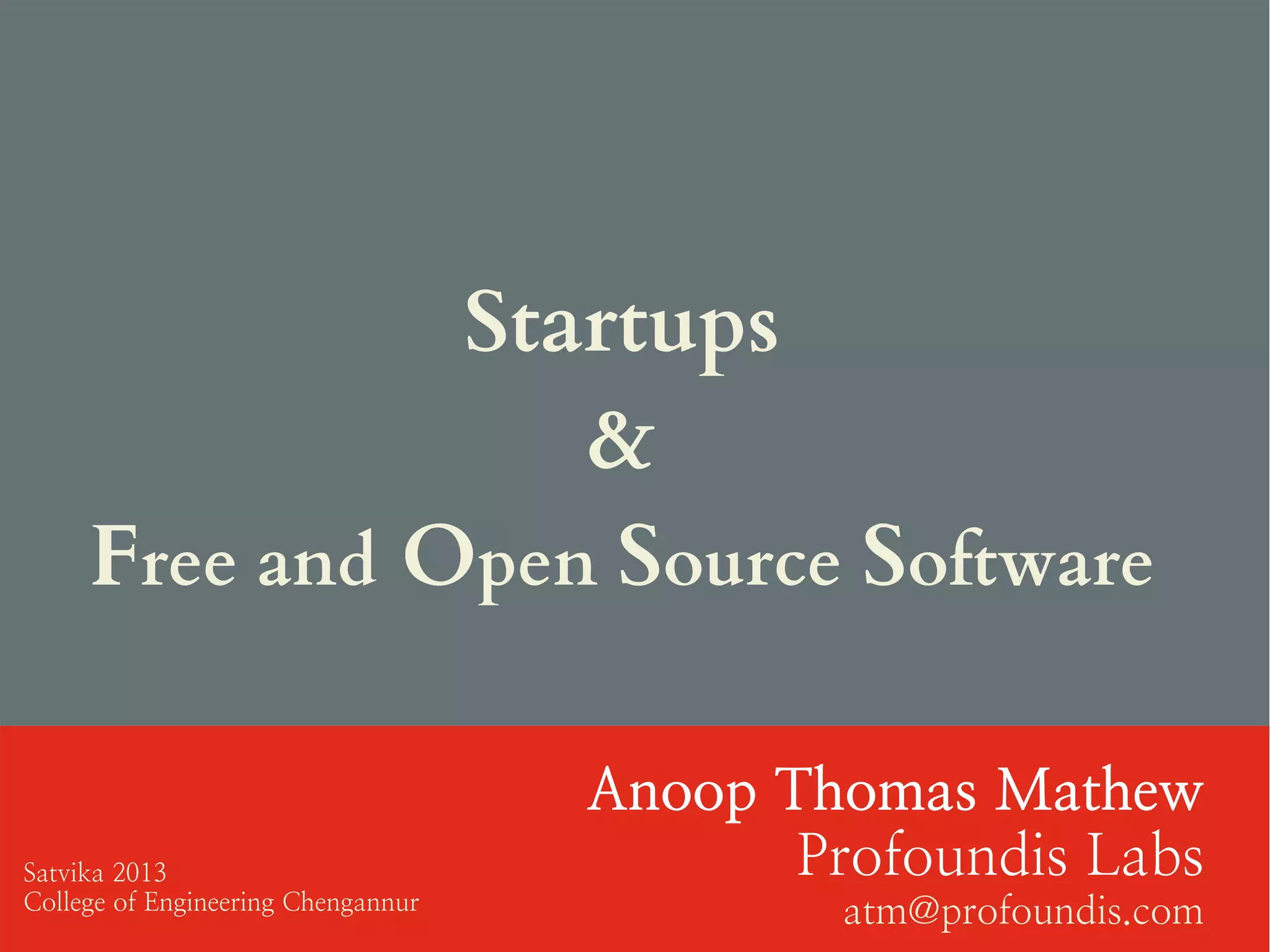 1. The document discusses how startups can benefit from using open source software and technologies.