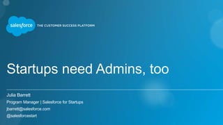 The document outlines a presentation by Julia Barrett from Salesforce for Startups, discussing the challenges startups face in adopting Salesforce's CRM due to perceptions of expense and scale. It introduces the startup-friendly program designed to ease access to Salesforce services, including templated solutions and support from Salesforce admins. The program aims to facilitate partnerships between startups and Salesforce by providing a structured process for engagement and negotiation.