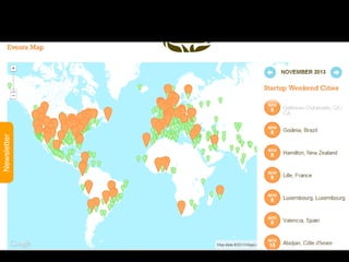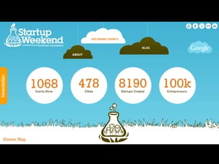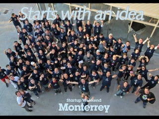 Startup Weekends are 54-hour events where developers, designers, and entrepreneurs collaborate to build prototypes for new businesses. The document outlines the schedule and activities for a Startup Weekend event, which begins on Friday with pitches, continues on Saturday with team formation and development, and ends on Sunday with final presentations and judging. It also describes sponsorship opportunities for the event, ranging from $100 to sponsor an entrepreneur to $5,000 for a premier sponsorship that includes addressing attendees and booth space.