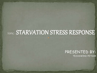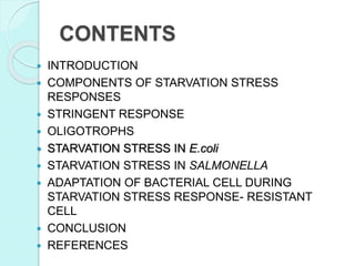 The document discusses starvation stress responses in bacteria. It describes how bacteria like E. coli and Salmonella induce universal stress proteins and alter gene expression through mechanisms like the stringent response when nutrients become scarce. This prepares the bacterial cells to survive extended periods of starvation by stopping growth, adapting their metabolism, and developing resistant cell morphologies. Key aspects of the starvation stress response discussed include the roles of RpoS, ppGpp, and morphological changes that increase resistance of bacterial cells to stress.