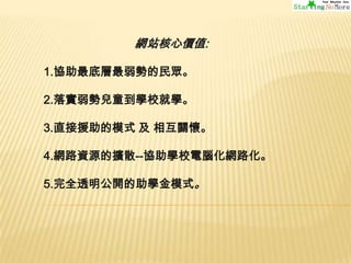 本平台旨在帮助弱势失学儿童重返校园,核心理念包括提供透明的资助和相互关怀。通过设立服务站、与学校合作及引入网络资源,提升失学儿童的教育机会。该项目的成效在于直接援助及关注儿童的综合发展,助力他们在经济困难中重新回到课堂。