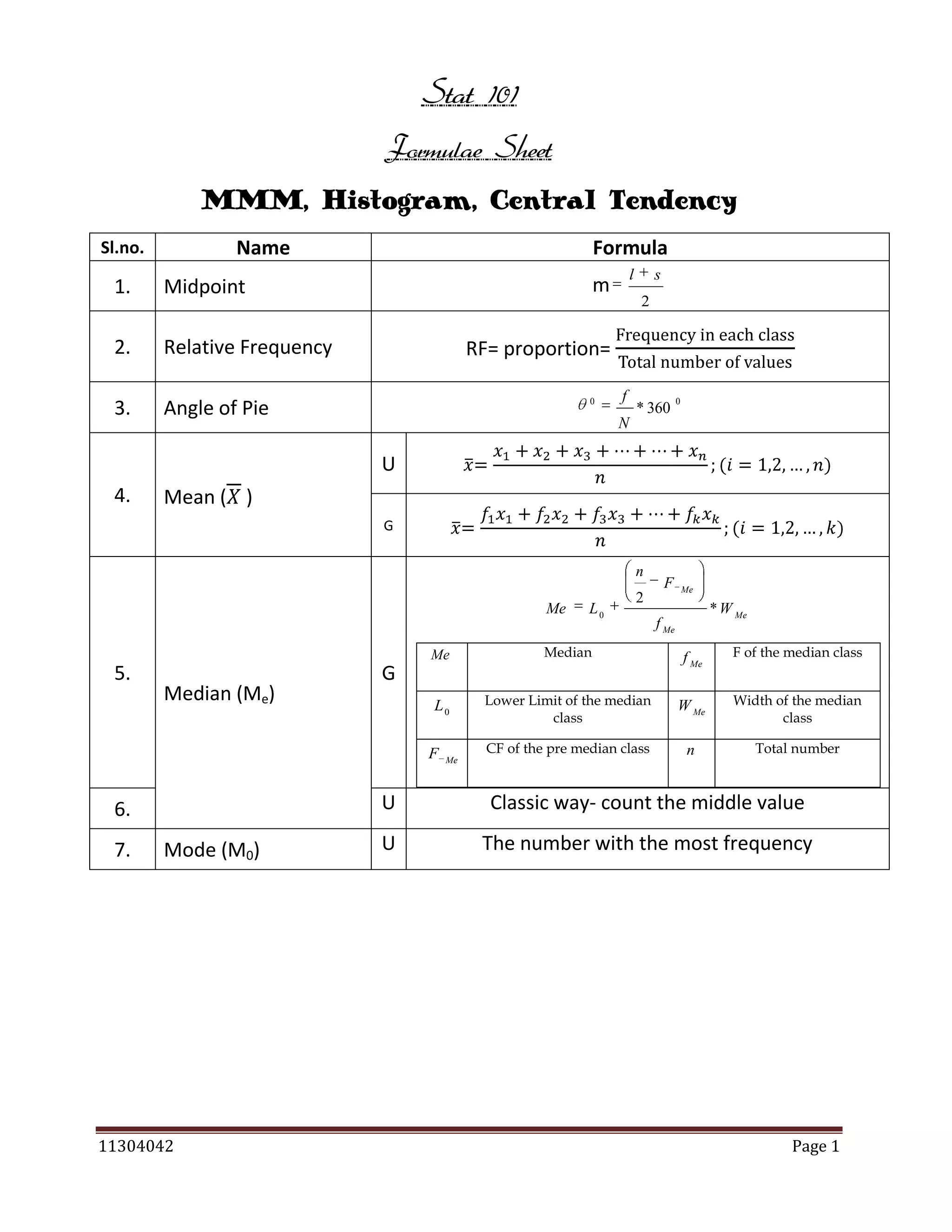 The document is a comprehensive statistics formula sheet detailing various statistical concepts including measures of central tendency, probability, sampling, quality control, and index numbers. It presents formulas for calculating means (arithmetic, geometric, harmonic), standard deviations, regression models, correlation coefficients, and several probability rules. Additionally, it includes methods for interpolation, extrapolation, and time series analysis, along with control chart parameters for quality control.