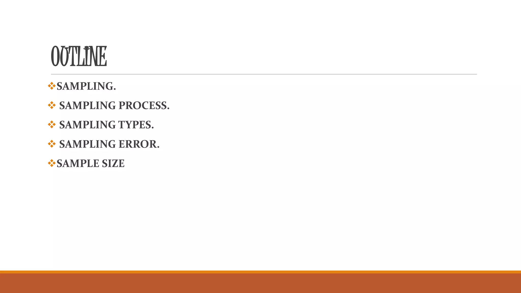 This document outlines key concepts related to sampling, including:
