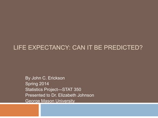 This document summarizes a student's statistical analysis project examining factors that predict life expectancy. The student collected data on 221 countries regarding birth rate, GDP, female literacy rate, and life expectancy. Descriptive statistics showed non-normal distributions. Simple linear regression of life expectancy on birth rate was significant but violated assumptions. Further research with additional variables and non-parametric methods could provide a better predictive model. Limitations included non-normal data and insufficient variables to fully address the question.