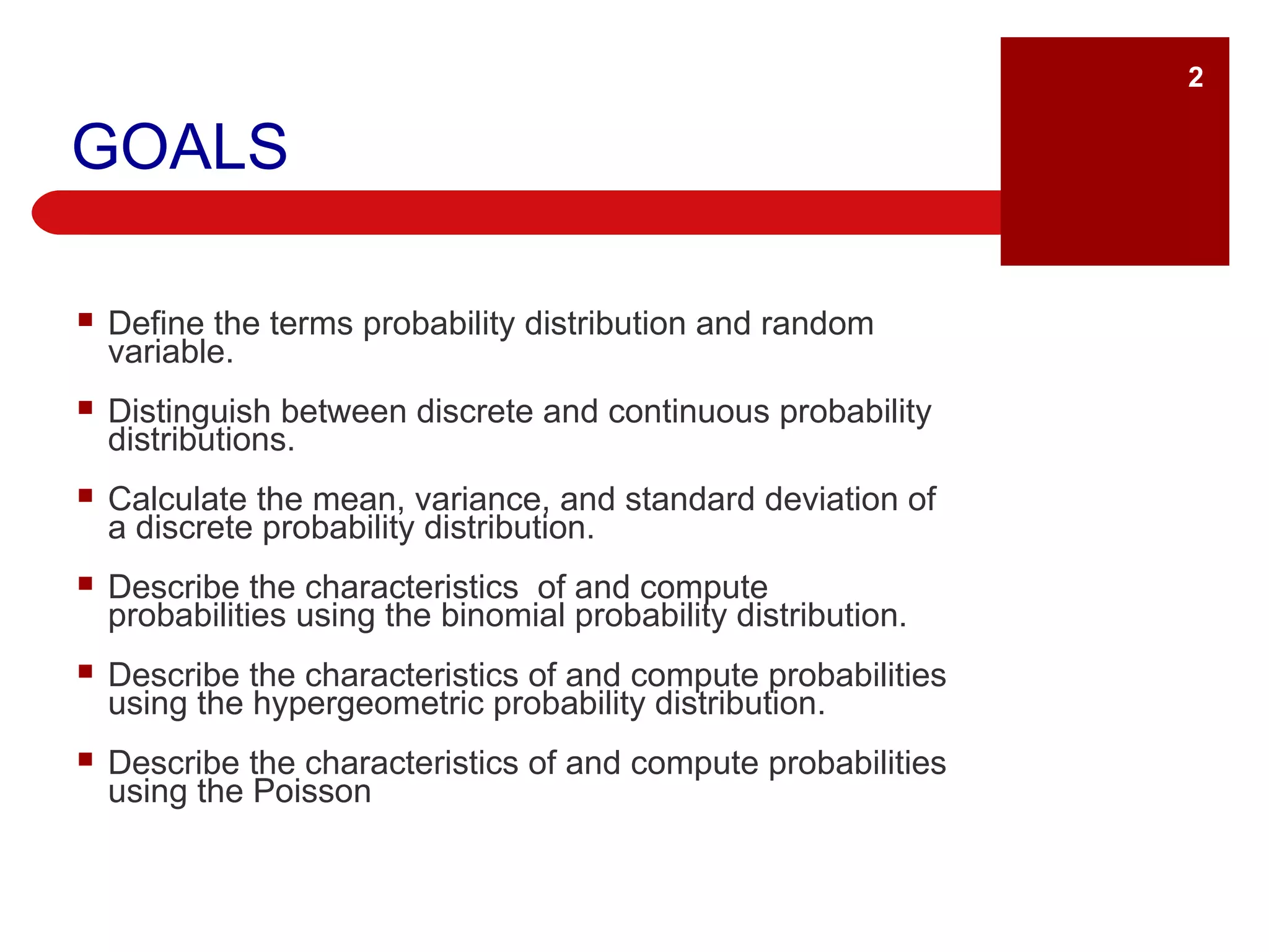 The document defines key terms related to probability distributions, including random variables, discrete and continuous distributions, and mean, variance and standard deviation. It provides examples of discrete and continuous random variables and describes the binomial, hypergeometric and Poisson distributions. Examples are given to show how to calculate the mean, variance and standard deviation of a discrete probability distribution.