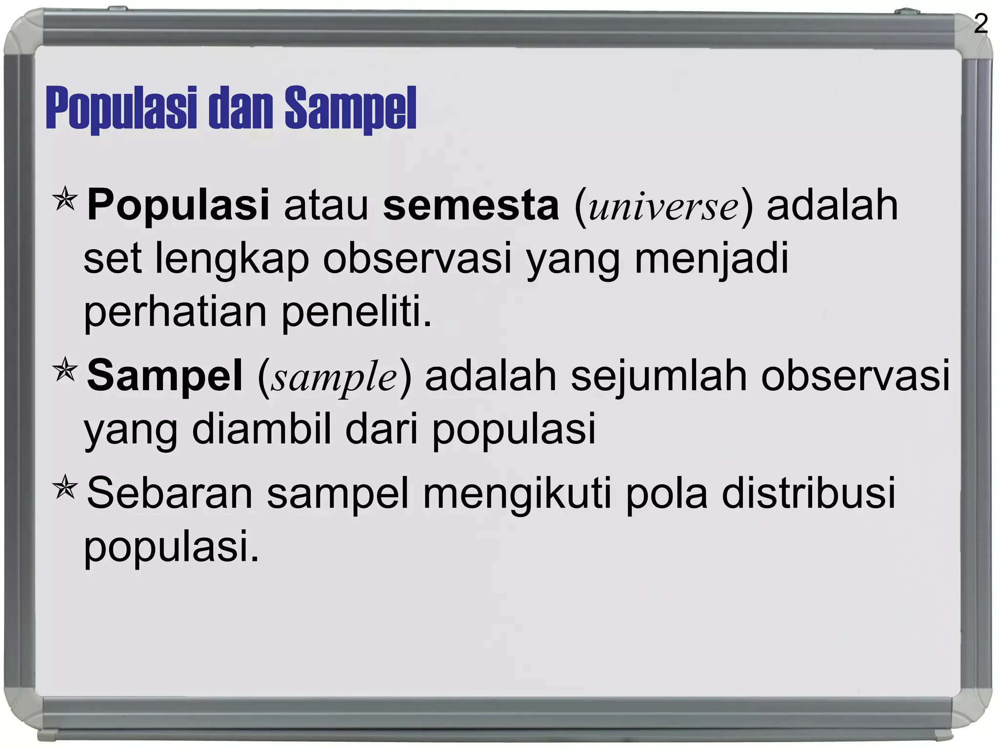 Dokumen ini membahas tentang pengambilan sampel dalam penelitian, termasuk definisi populasi dan sampel, proses, alasan, serta syarat pengambilan sampel yang baik. Selain itu, dijelaskan kesalahan yang mungkin terjadi dalam pengambilan sampel dan metode yang dapat digunakan untuk menghindari kesalahan tersebut. Penentuan ukuran sampel, serta penerapan metode pengambilan sampel yang tepat juga menjadi fokus utama untuk mencapai hasil yang representatif.