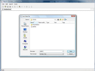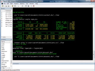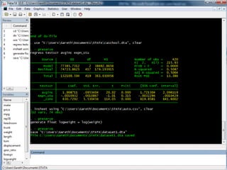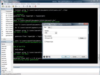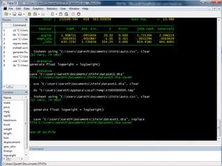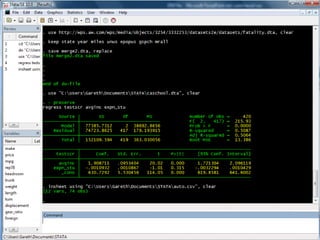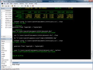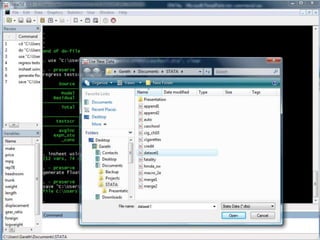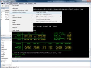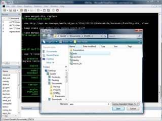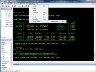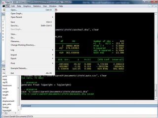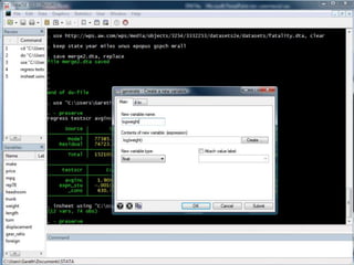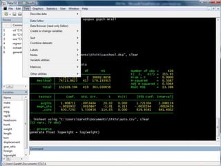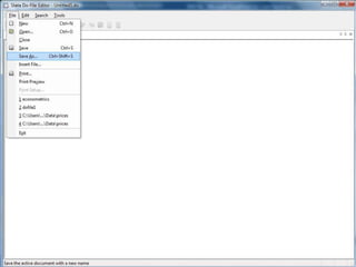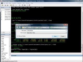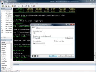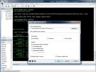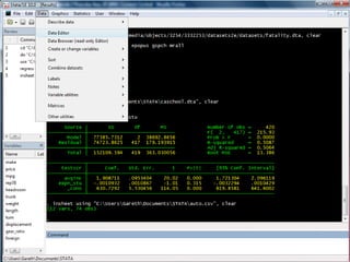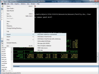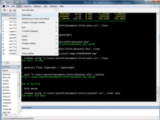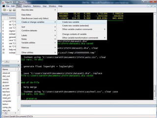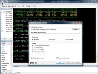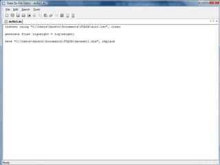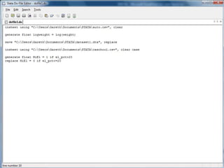 This document provides an outline for a tutorial on importing and editing data in Stata. It discusses importing comma-separated value files, generating new variables, saving and reopening datasets, creating do-files, using Stata's help system, and presents a challenge involving creating a dummy variable using imported data. The tutorial materials are based on examples from an introductory econometrics textbook and the datasets can be downloaded from Stata's website.