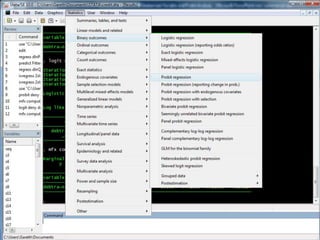 This document provides an outline for tutorials on using STATA software to conduct probit and logit analysis. It describes datasets used in examples from an econometrics textbook. The tutorials cover opening datasets, running probit and logit models, and conducting a challenge analysis estimating the impact of race on denial rates using a probit model. The website listed provides step-by-step guides and downloads for additional STATA tutorials.