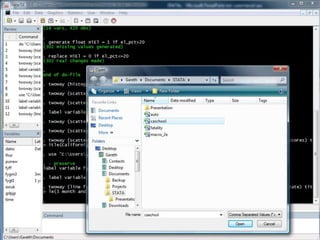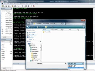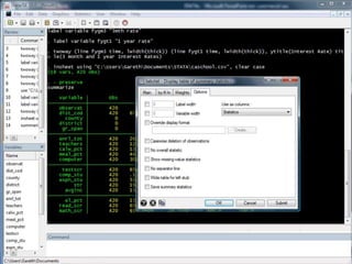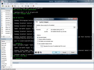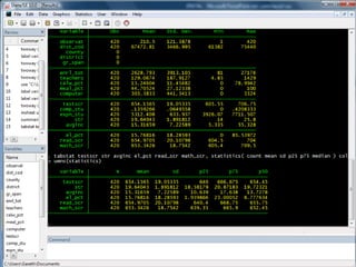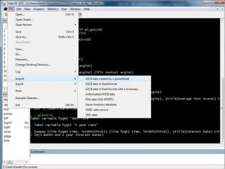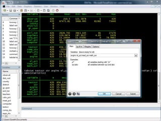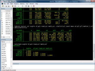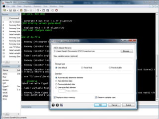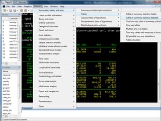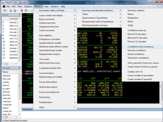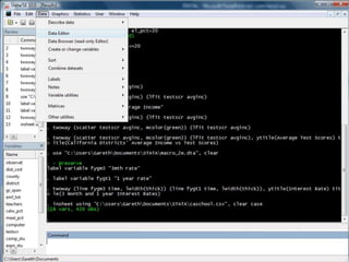 This document provides an outline and overview of tutorials for using the STATA data analysis software. It describes how the tutorials use sample datasets from an econometrics textbook and how readers can download these datasets. The outline lists topics covered in the statistical analysis tutorials, including how to open datasets, summarize data, create custom tables, and analyze correlations in STATA. It also directs readers to the website to access step-by-step screenshot guides and download tutorials on additional STATA topics.