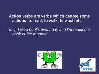 The document discusses different types of verbs in English: action verbs and state verbs. Action verbs denote actions like "to read" or "to walk", while state verbs describe a state of being and cannot be used in continuous tenses. Some examples of state verbs given are verbs expressing likes/dislikes, verbs of the senses, and verbs of perception. However, some state verbs can be used in continuous tenses when they describe actions rather than states.
