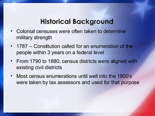 State and colonial censuses were often taken for military or tax purposes and provide important genealogical information. They have strengths like placing individuals at a time and place and documenting relations. Weaknesses include legibility, undercounting remote areas, and inaccuracies. State censuses may ask different questions than federal censuses and fill gaps when federal censuses are missing. They provide details like birthplaces, occupations, and veteran status. Availability varies by state with some having no records after a certain period. Bibliographies and resources are listed to locate existing state census records.