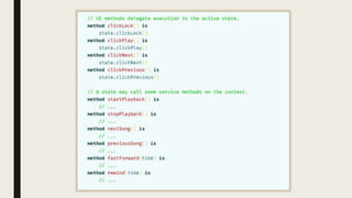 The document explains the state design pattern, a behavioral design pattern that enables an object to alter its behavior based on its internal state changes, closely related to finite state machines. It outlines the structure, pros and cons, and provides examples of its applicability in various contexts, such as document management and TCP/IP protocols. Additionally, it contrasts the state pattern approach with traditional state management methods that rely on complex conditional statements.