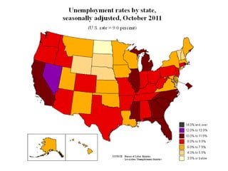 As of October 2011, the U.S. unemployment rate slightly decreased to 9.0%, with 36 states improving their rates while 10 states and D.C. still had double-digit unemployment. New Mexico, Florida, and Nevada showed the most significant year-over-year improvements. In terms of job growth, 39 states experienced positive trends in October, contributing to a national net job increase of approximately 80,000.