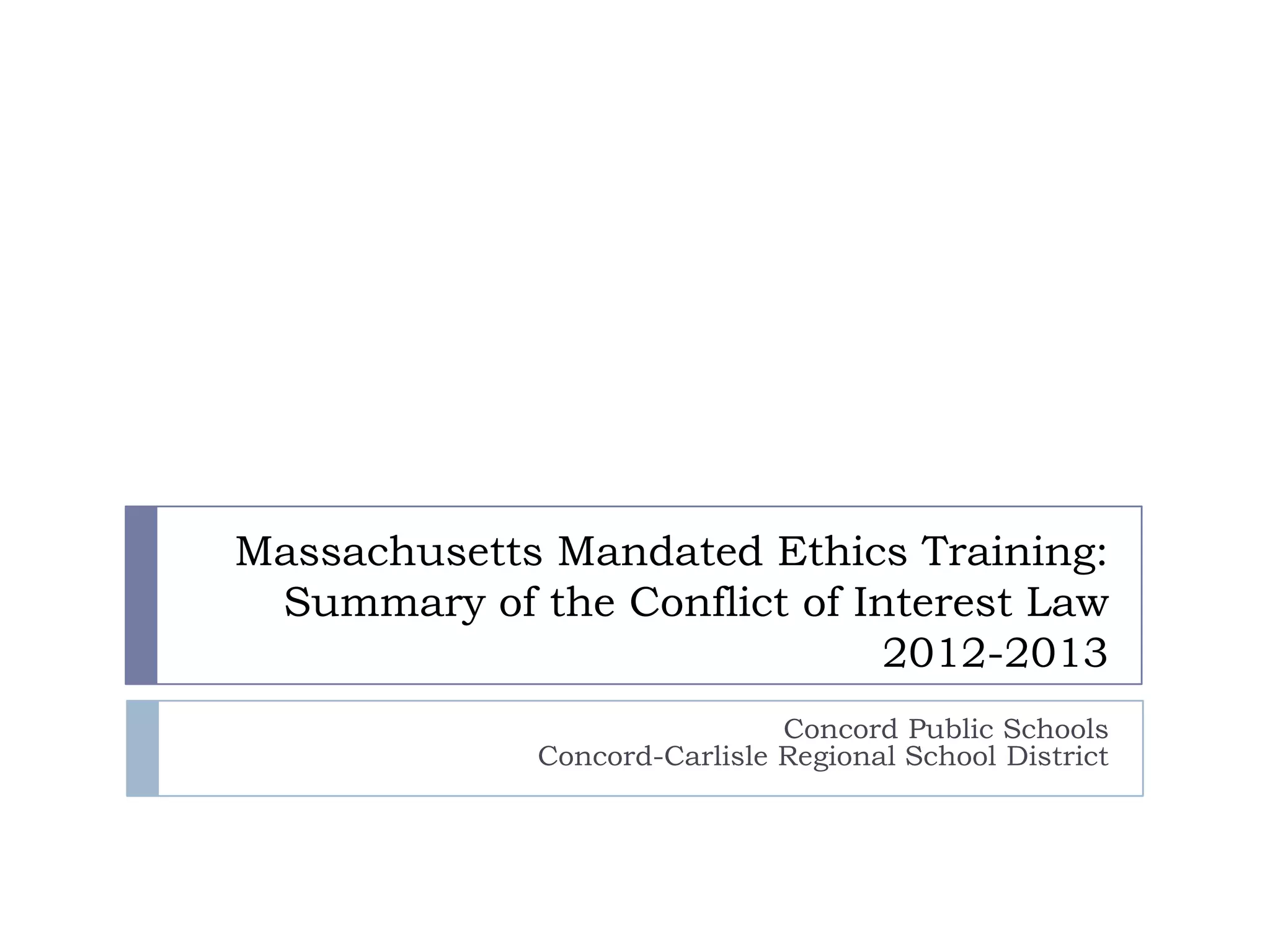 The document summarizes Massachusetts' conflict of interest law for municipal employees. It outlines restrictions on gifts, bribes, misuse of position, conflicts of interest, and other ethical issues for employees both during and after public service. It requires all state, county and municipal employees, including volunteers and consultants, to complete online ethics training developed by the State Ethics Commission every two years.