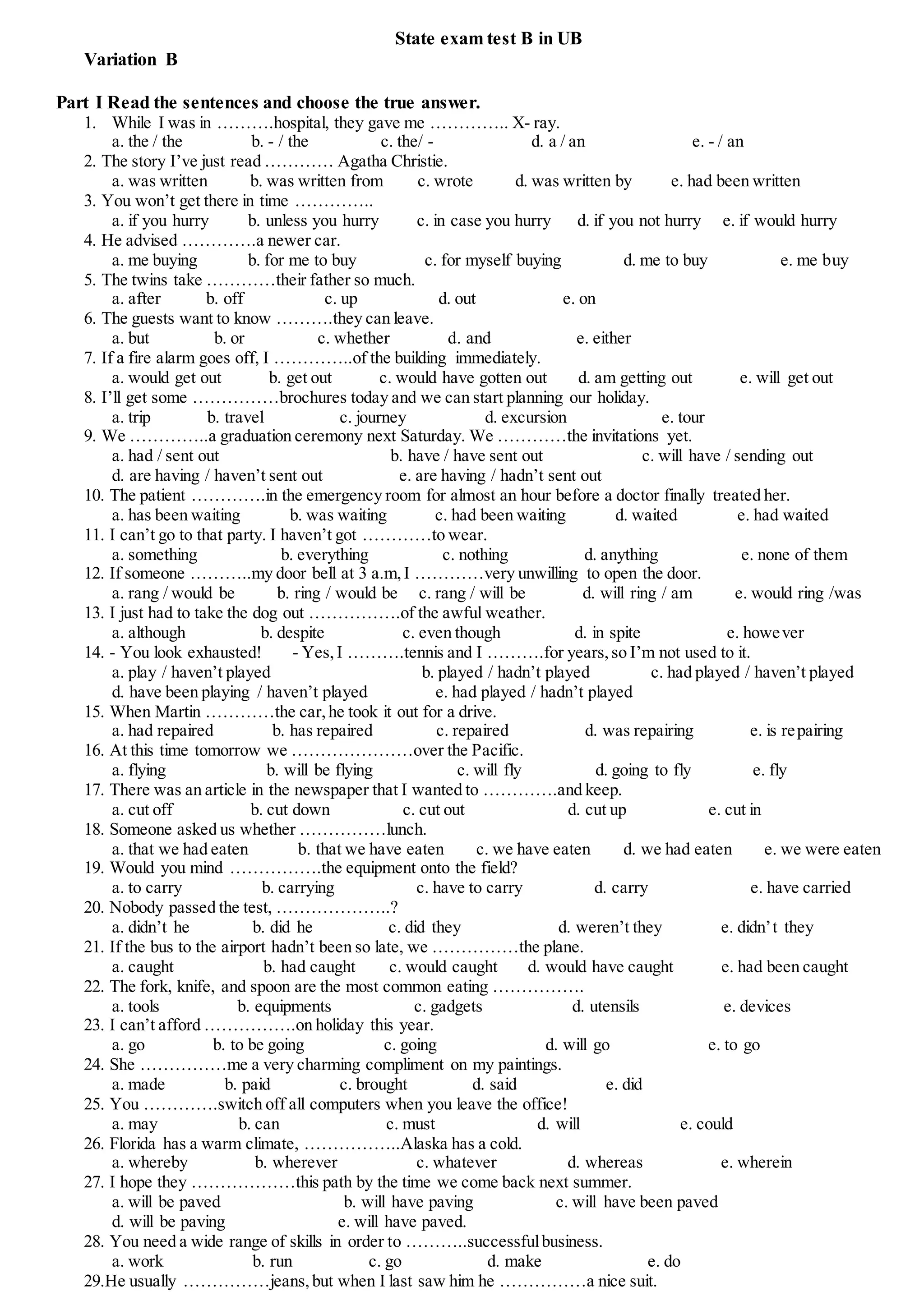 This document contains a test for state exam B in UB. It has two parts - Part I contains 36 multiple choice questions testing grammar and vocabulary. Part II contains a passage about Miss Leary, an assistant librarian, and 6 multiple choice questions about the passage. The test examines knowledge of grammar, vocabulary, and reading comprehension.