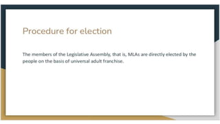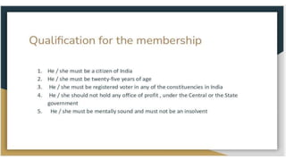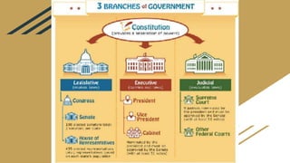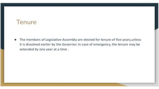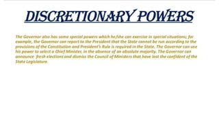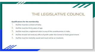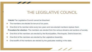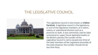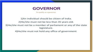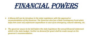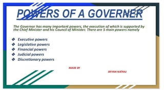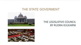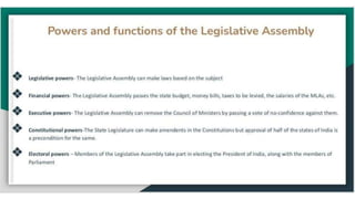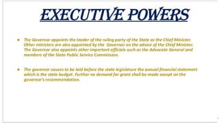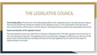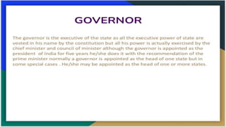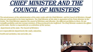 The document summarizes how state governments in India work. It explains that India has a federal system with both a central government and independent state governments. Each state government is responsible for governing its own state and manages affairs through three branches - the legislature that makes laws, the executive that enforces laws, and the judiciary that resolves legal disputes. Power is divided between the central and state governments through three lists that delineate authority over different policy areas. Key roles of the state government include administering the civil service and appointing an Advocate General to act as the state's legal advisor.