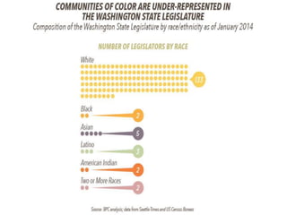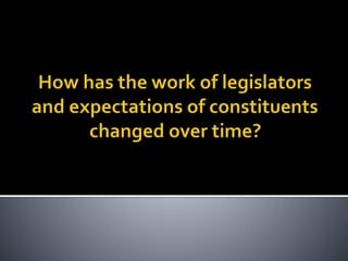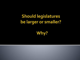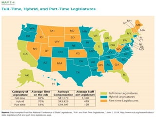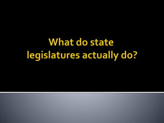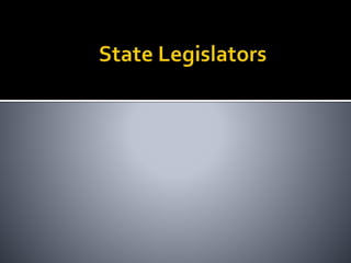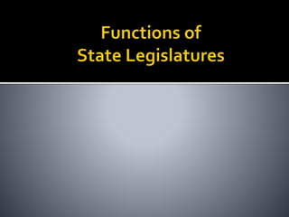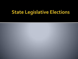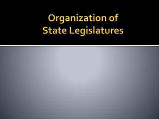 This document provides an overview of state legislatures, including their roles in lawmaking, representation, constituent services, oversight, appropriations, and impeachment. It discusses the structure of state legislatures, including the types and names of legislative chambers. The document also covers trends in legislative professionalism using Squire's measure of salaries, session length, and staff/resources. Additionally, it addresses redistricting approaches and the demographics of state legislative membership.