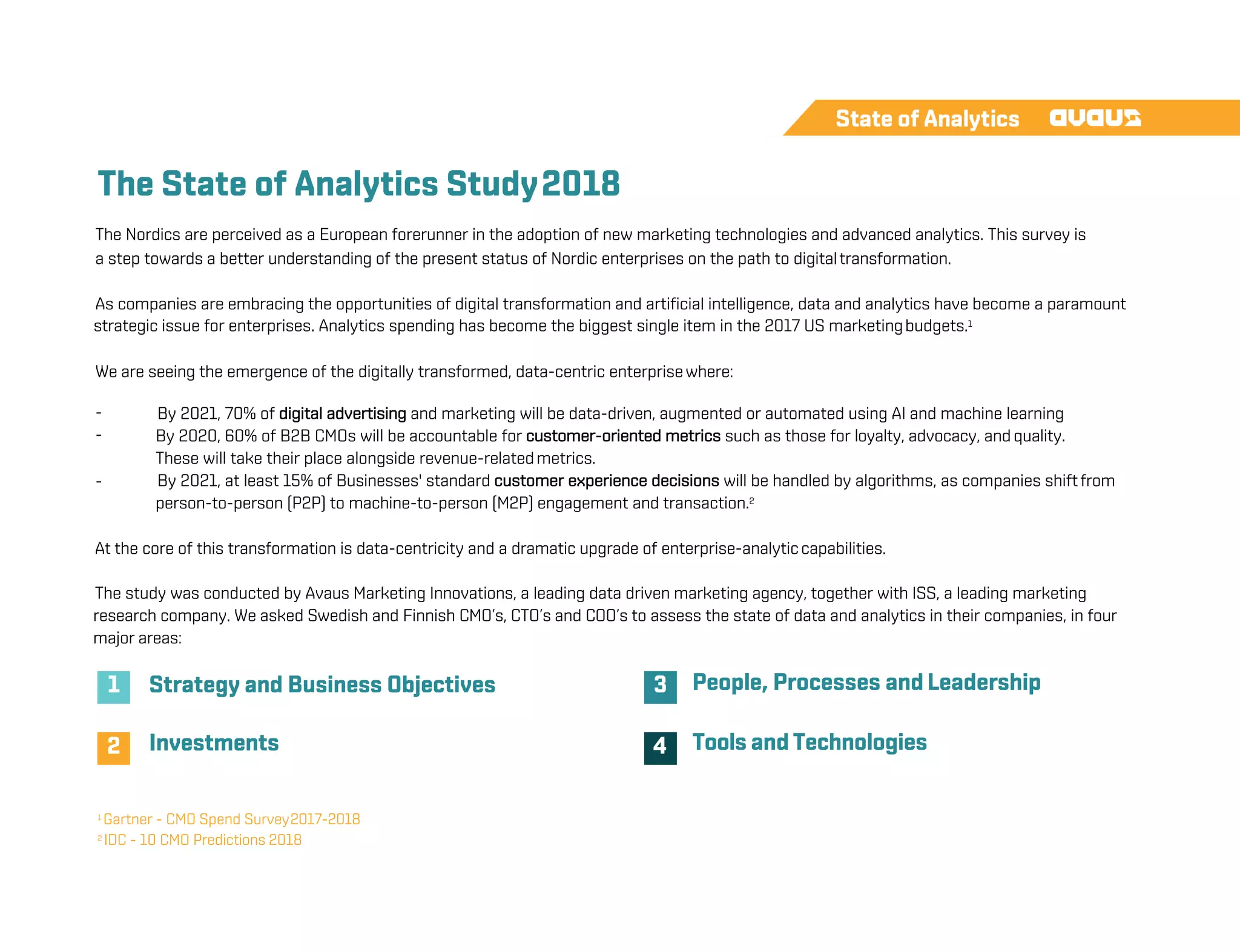 The 2018 State of Analytics study highlights the Nordic region as a leader in adopting marketing technologies and advanced analytics, emphasizing the importance of data-driven decision-making in digital transformation. Forerunners in analytics report a 63% revenue boost compared to only 50% of followers, yet only a small percentage of companies effectively utilize analytics for customer journey management. The study indicates a notable gap in analytics familiarity among C-suite executives and underscores the need for enhanced analytics prioritization and investment.