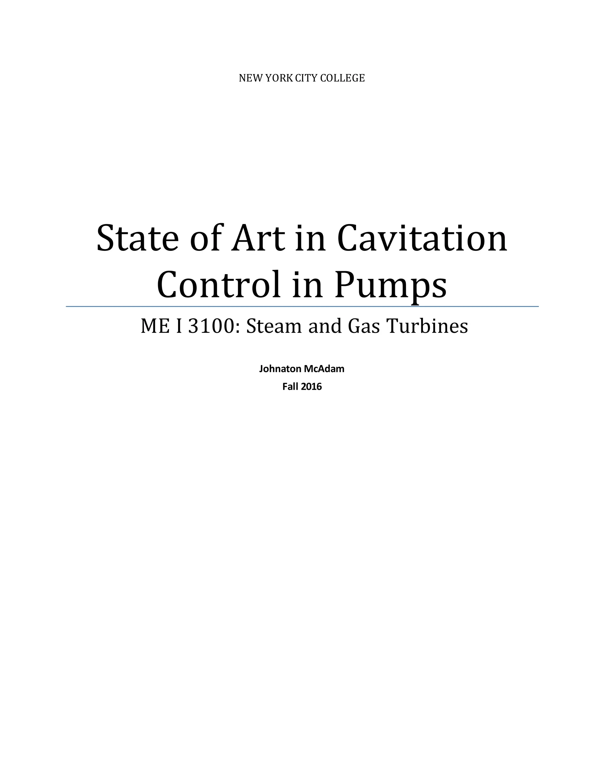 This document discusses cavitation in pumps. It defines cavitation as the formation of vapor bubbles in a liquid when low pressure causes the liquid to transition to a vapor state. There are two types of cavitation described - inertial (transient) cavitation where bubbles quickly form and collapse, releasing energy as shockwaves, and non-inertial cavitation where bubbles undergo controlled collapse. Cavitation in pumps can be suction cavitation where low pressure at the pump inlet causes bubble formation, or discharge cavitation where high pressure makes it difficult for fluid to exit and bubbles form. Causes of cavitation include poor pump design, low net positive suction head, high fluid temperature, high velocities, debris buildup, and