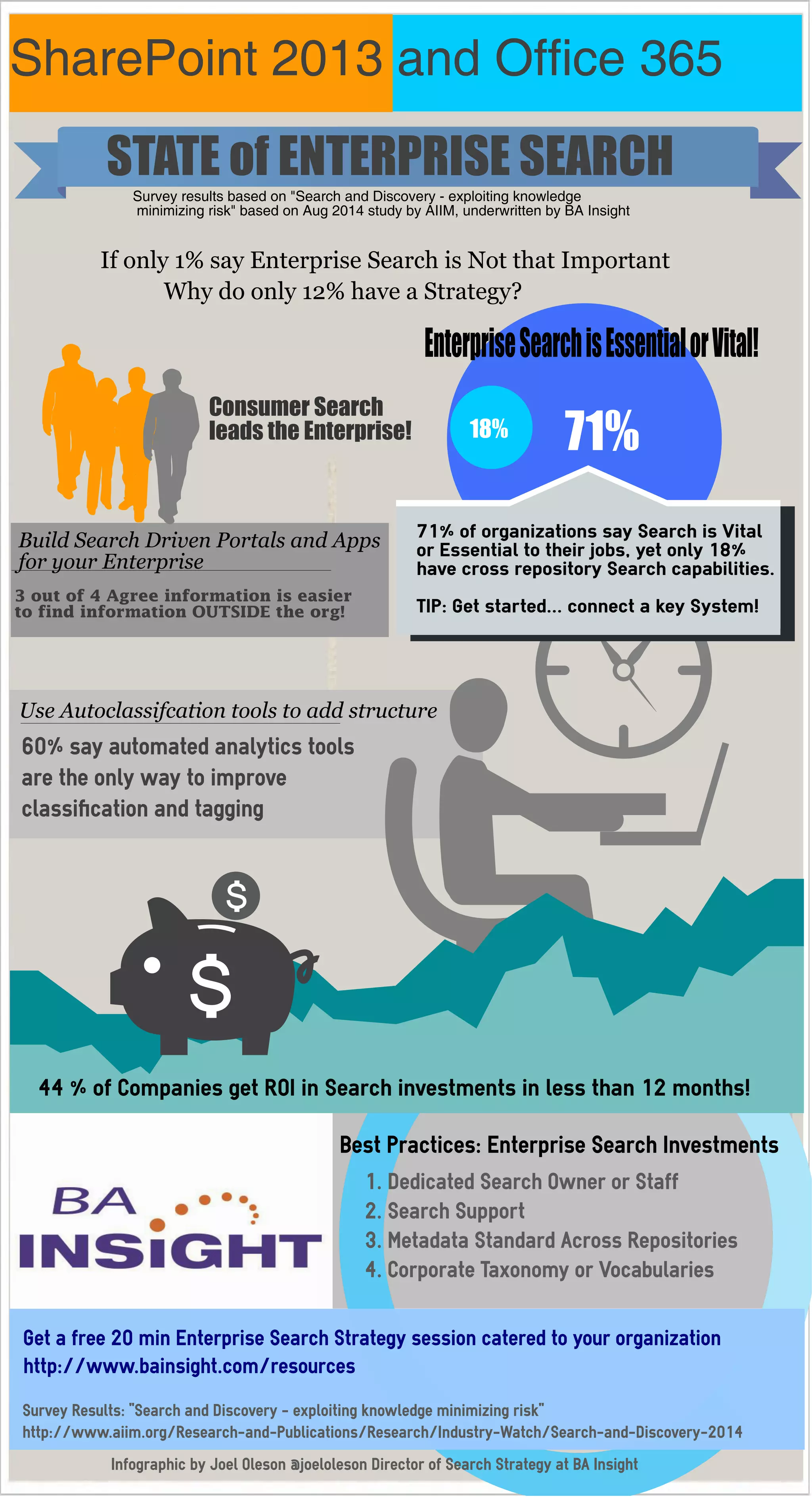 Enterprise SharePoint and Office 365 survey based data collected in August 2014 by AIIM research and underwritten by BA Insight. Infographic produced by Joel Oleson, Director of Enterprise Search Strategy.