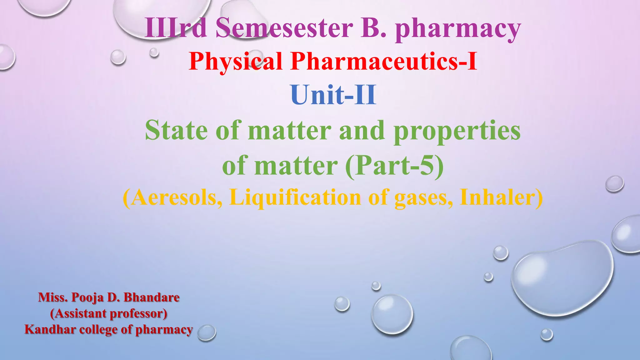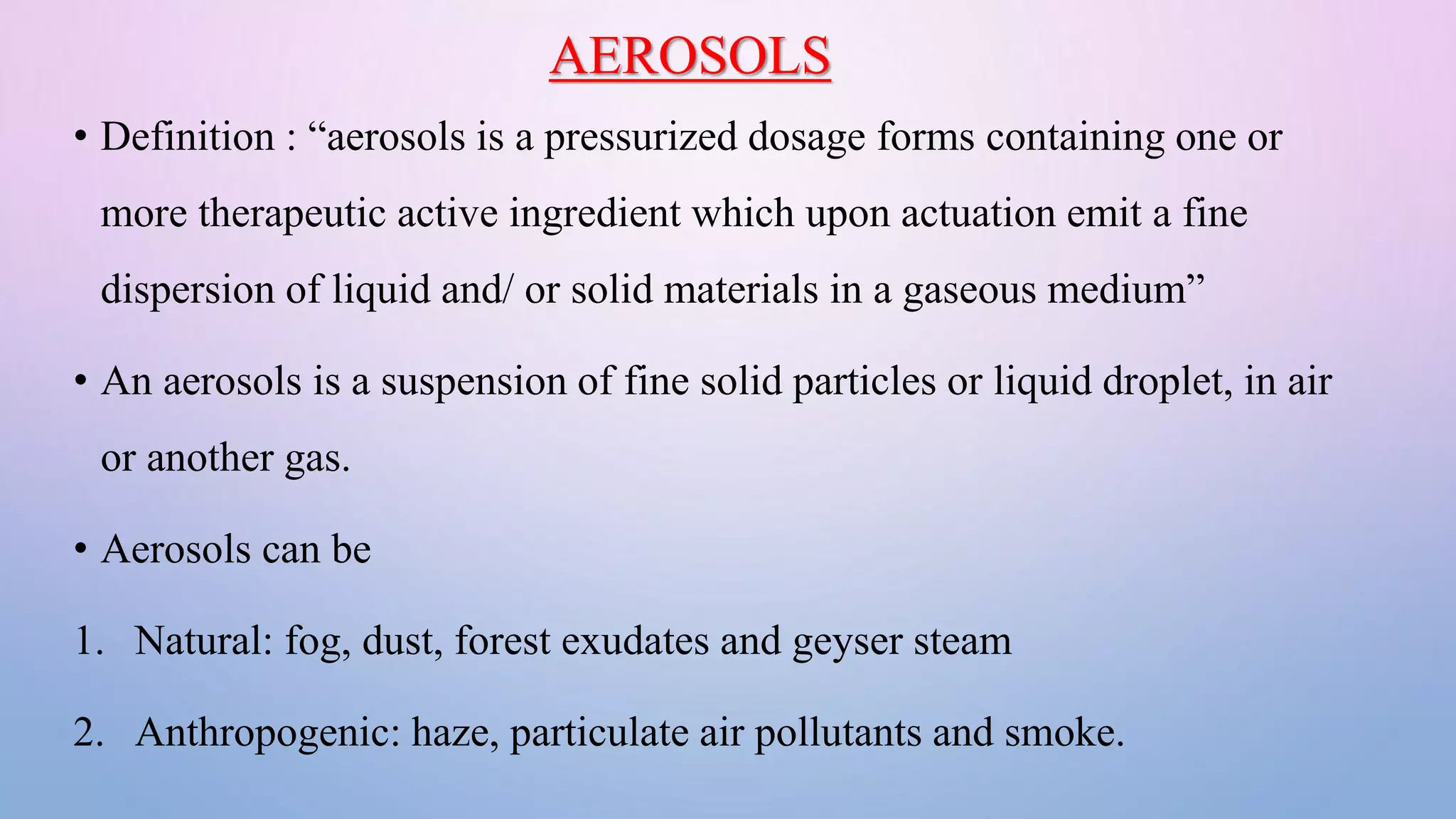 This document discusses aerosols and inhalers. It defines aerosols as fine dispersions of liquid or solid particles in a gas. Aerosols can be natural or man-made. The key components of aerosols include the propellant, product concentrate, container, and actuator/valves. The document explains that gases can be liquefied under high pressure and revert to gas when pressure is reduced, which is the principle behind aerosol preparation. It notes that inhalers deliver medicine through inhalation and come in metered-dose, dry powder, and nebulizer forms.