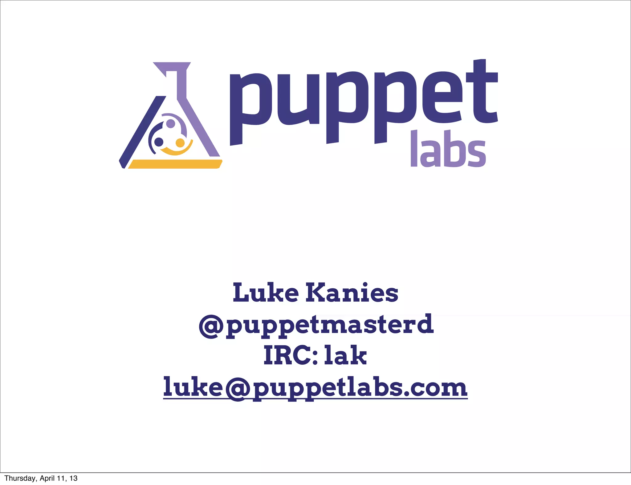 This document appears to be the slides from a presentation given by Luke Kanies on Thursday, April 11, 2013. The presentation covered topics such as the state of IT, DevOps, cloud computing, Puppet architecture, Puppet Enterprise features, how to adopt Puppet, the Puppet community and Forge, and Puppet Labs as a company. It provided statistics on growth in the community and company and encouraged participants to get involved.