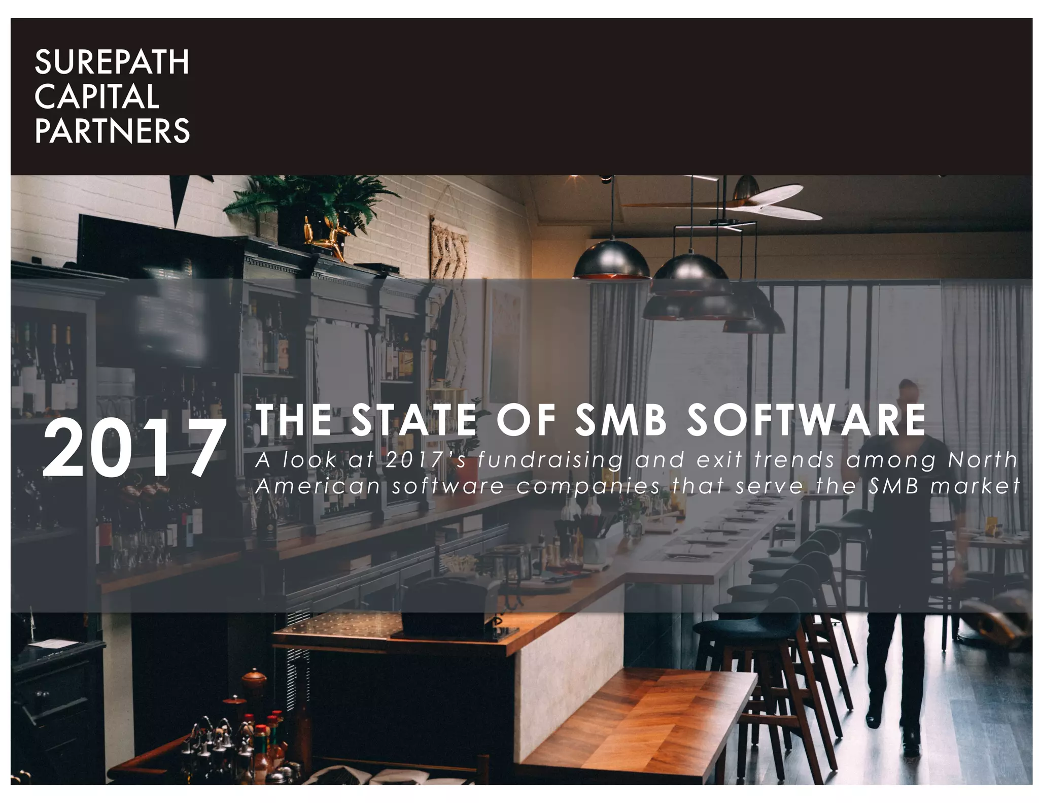 The document presents the 2017 State of SMB Software report, focusing on fundraising and exit trends for North American software companies serving small and mid-sized businesses (SMBs). It analyzes over 3,700 deals, highlighting that venture capital funding was the most significant, with notable activity in the front office sector, while private equity deals showed growth potential. The findings indicate a strong interest in SMB software, with substantial capital investment and a diverse range of companies operating across various categories.