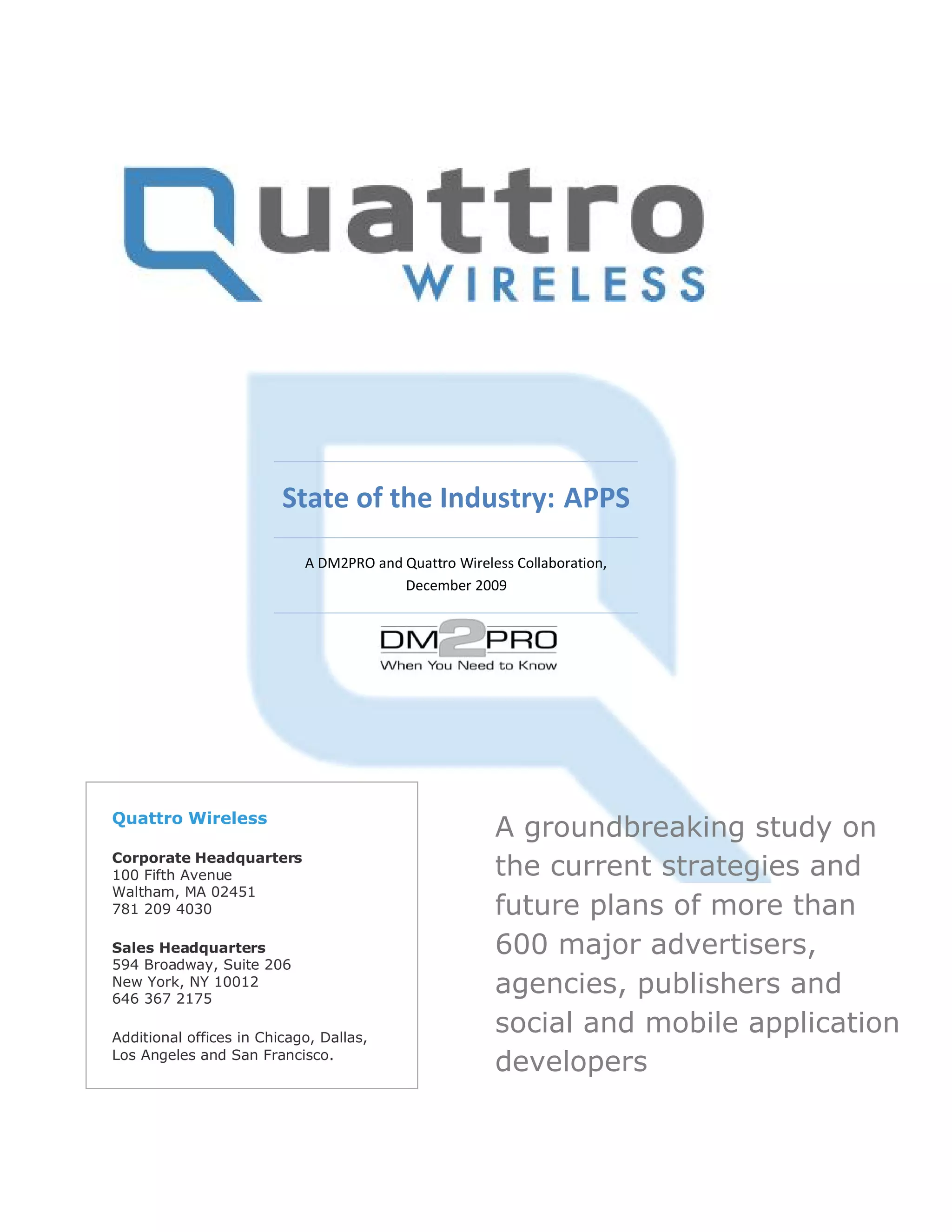 This document summarizes a study of over 600 major advertisers, agencies, publishers and app developers on their strategies and plans for social and mobile applications. The key findings were: