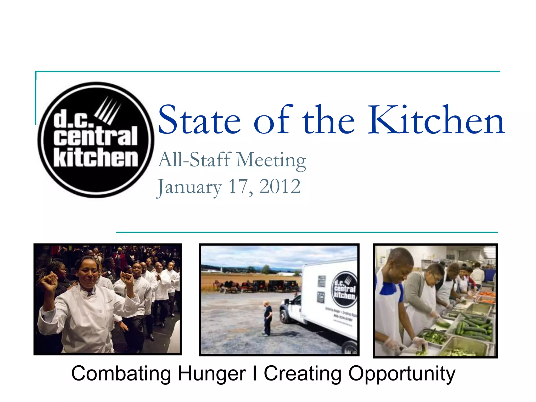 This document summarizes the state of DC Central Kitchen in 2011-2012. It discusses the core programs including food distribution and job training. It highlights the social enterprises like the Nutrition Lab and Fresh Start catering business. It provides statistics on meals served, revenue generated, and job training graduates. It outlines the national Campus Kitchens Project and speaking engagements. It includes organizational charts and upcoming goals and dates. The document gives an overview of the organization's programs, finances, operations, and future plans.