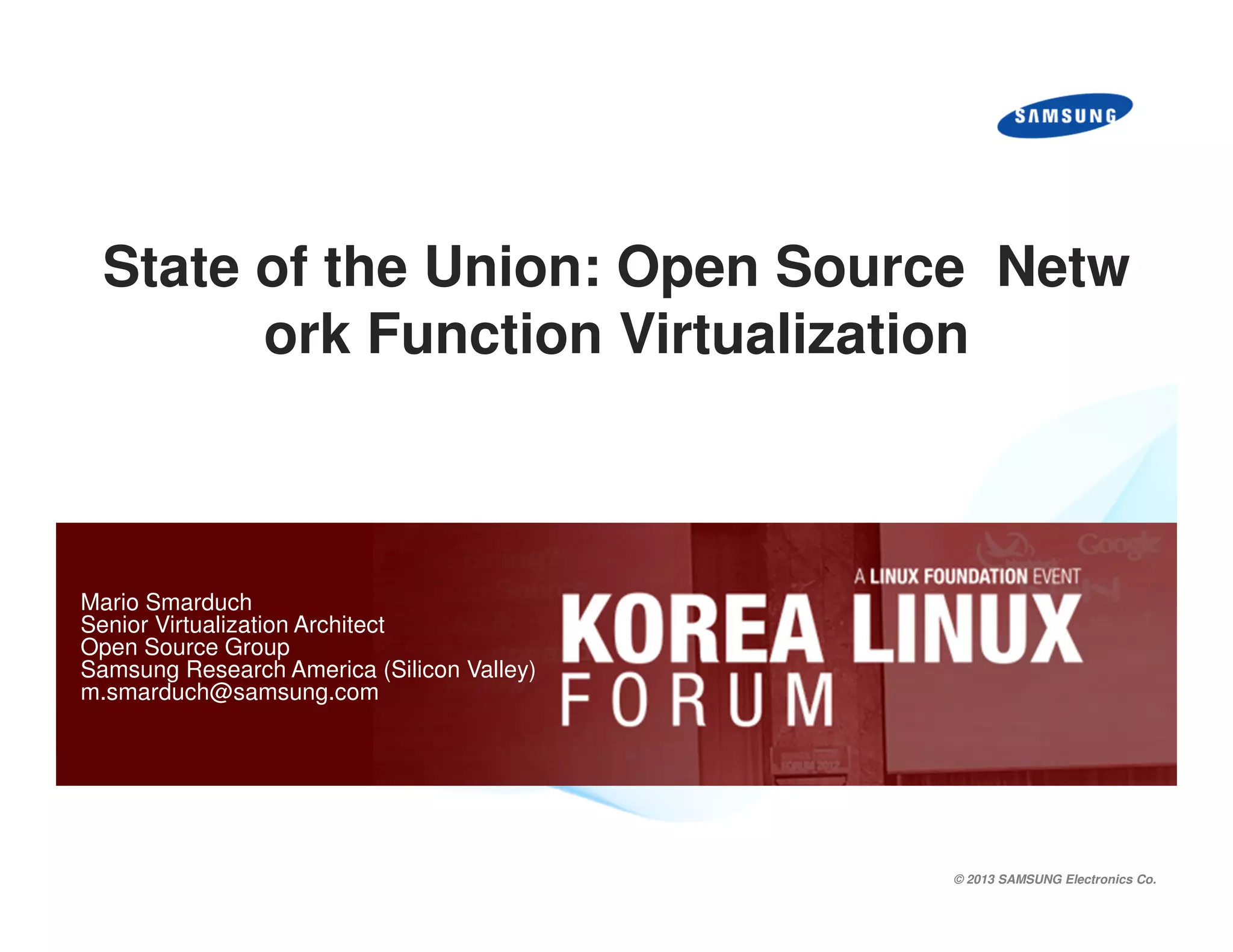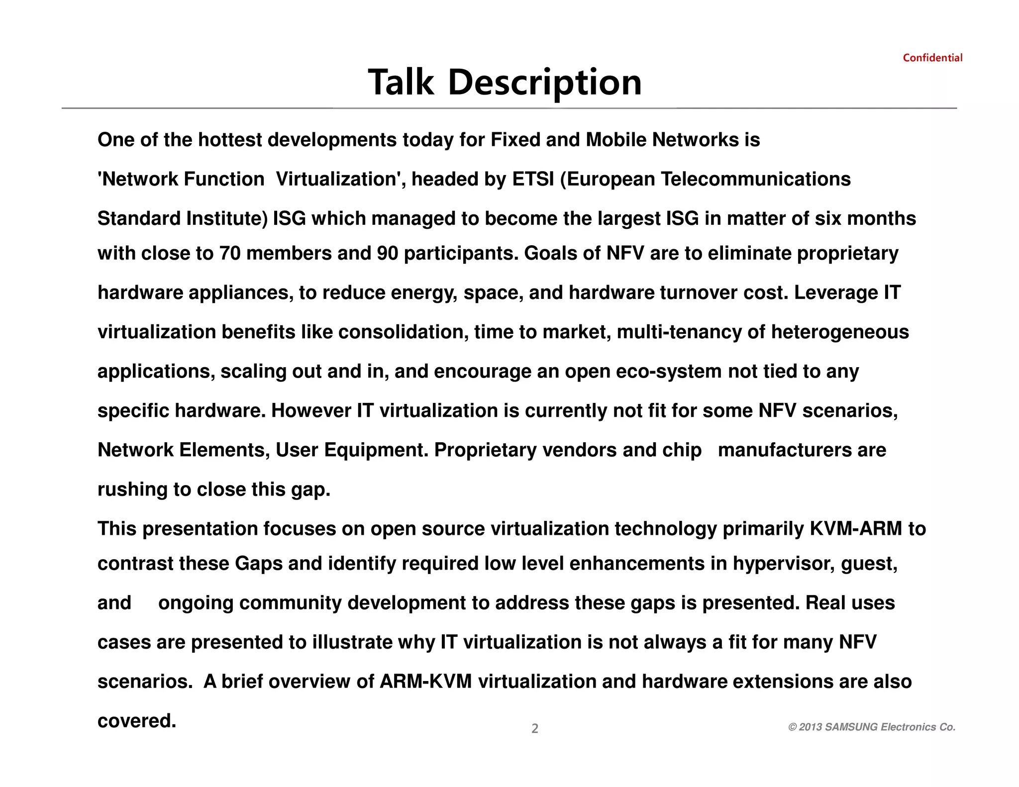 The document discusses Network Function Virtualization (NFV) led by ETSI, with an emphasis on eliminating proprietary hardware and leveraging IT benefits such as consolidation and multi-tenancy. It highlights the limitations of current virtualization technologies like KVM-ARM in certain NFV scenarios and the push for enhancements by proprietary vendors. Use cases illustrate challenges in applying existing virtualization solutions to mobile and fixed networks, demonstrating the need for ongoing development in this area.