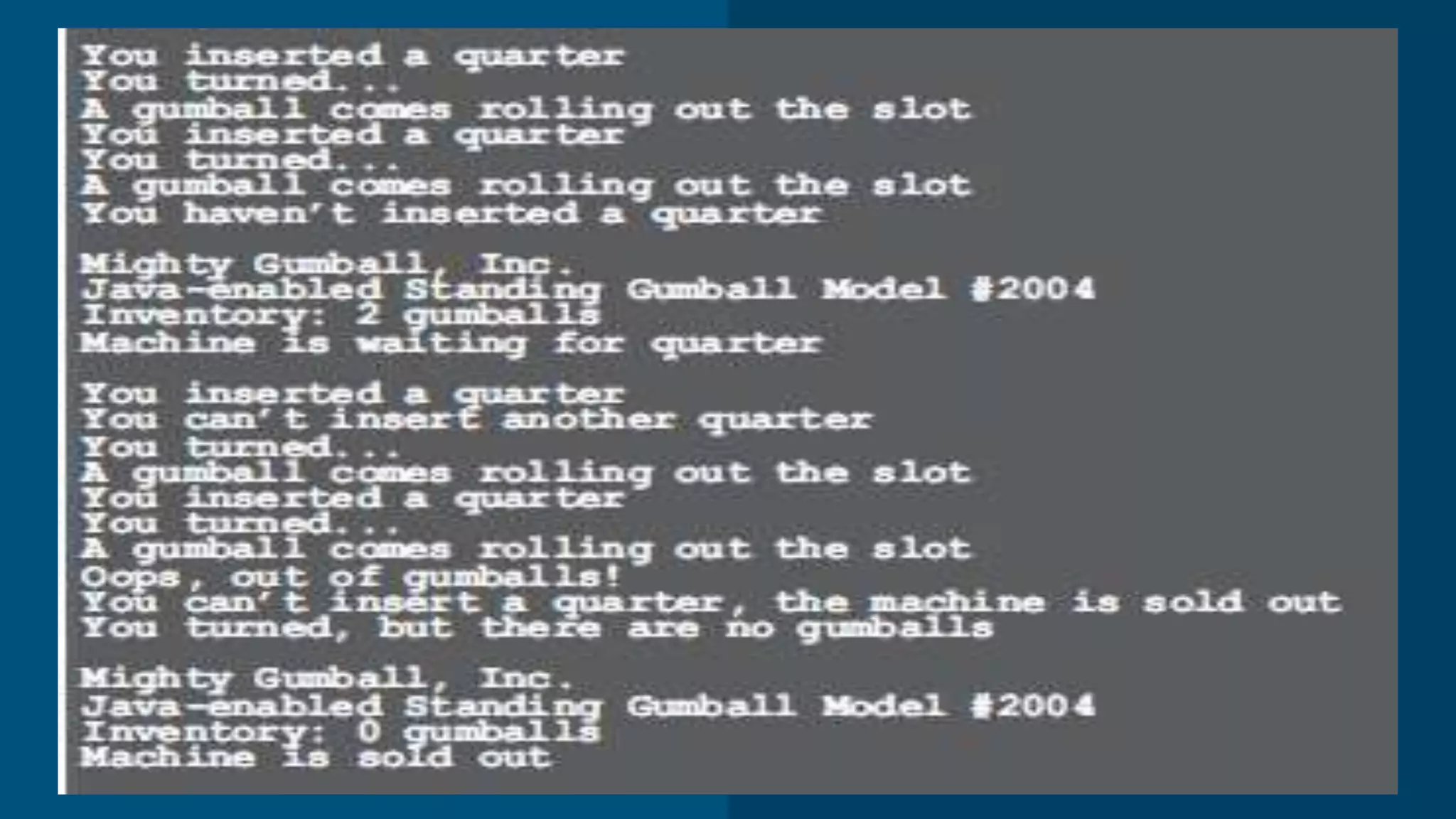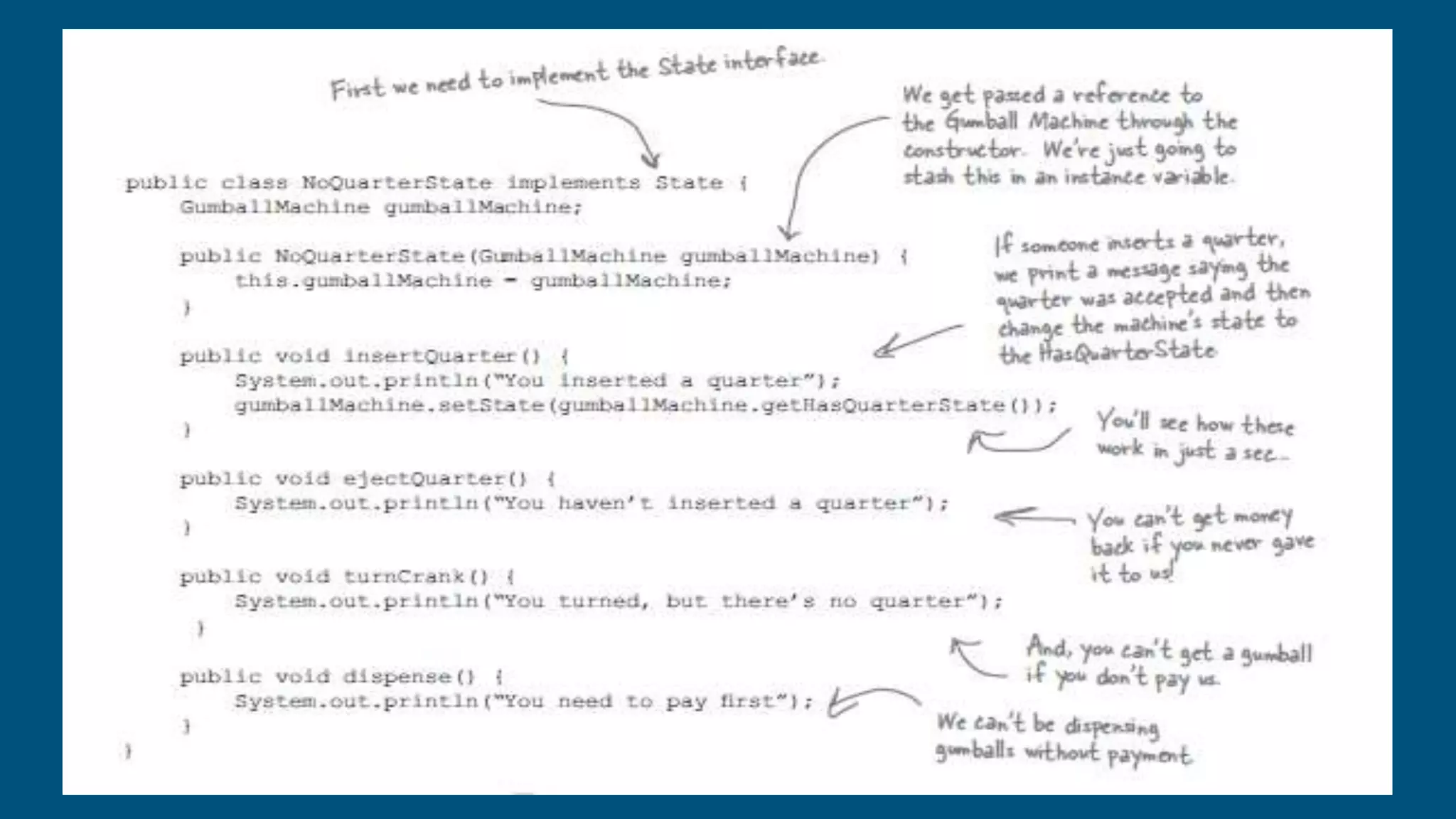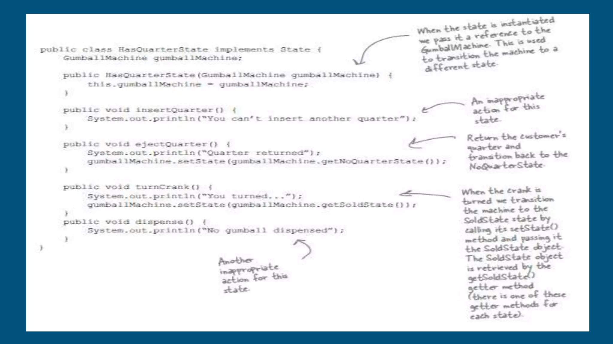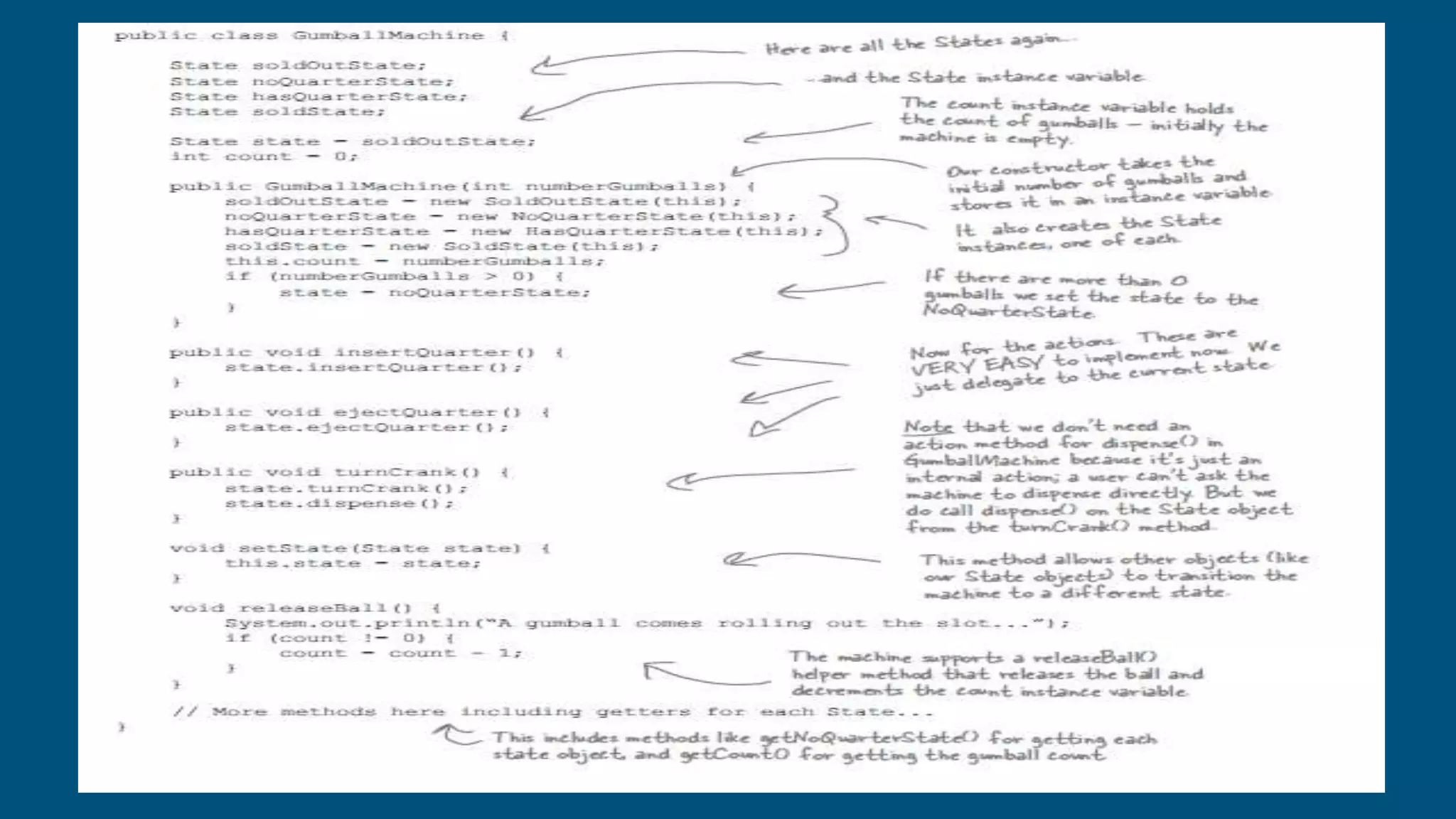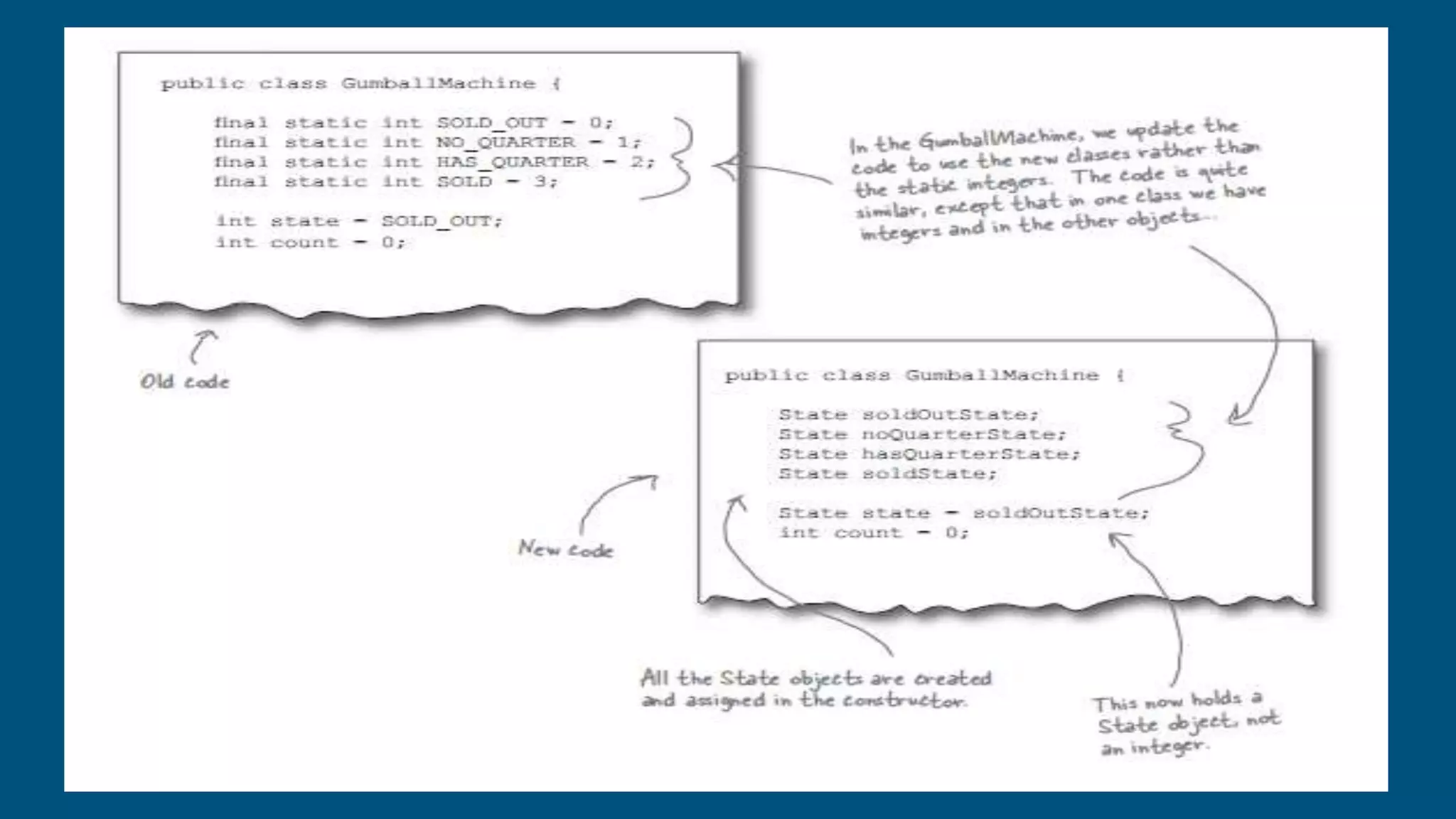 The document describes the state pattern and its implementation using a gumball machine example. The state pattern allows an object to change its behavior when its internal state changes, making it appear that the object has changed its class. The document outlines defining a State interface and implementing state classes for each machine state. It also describes reworking the Gumball Machine class to delegate to the appropriate state class and removing conditional code. This implements the state pattern and allows changing the gumball machine's behavior by changing its current state object.