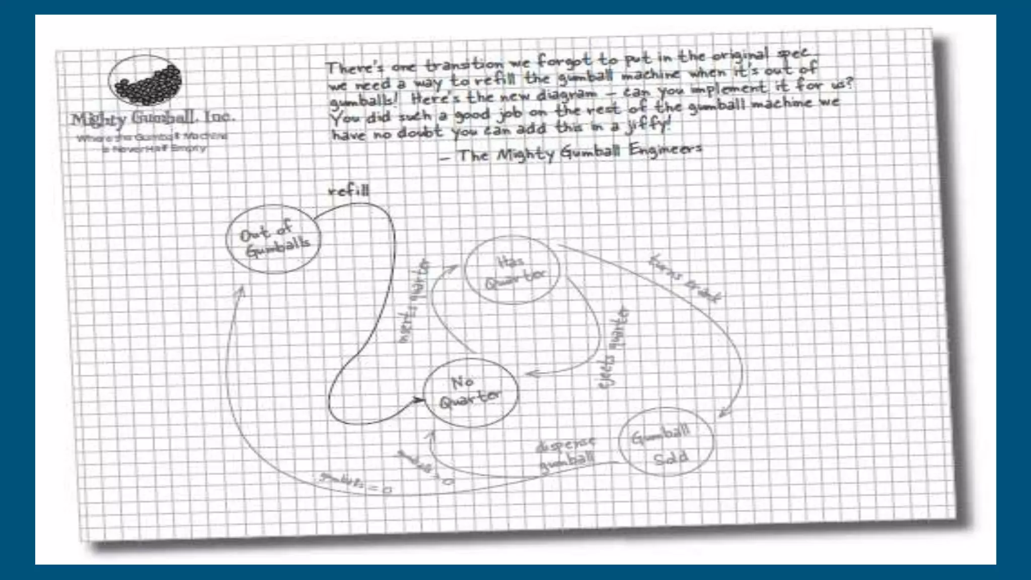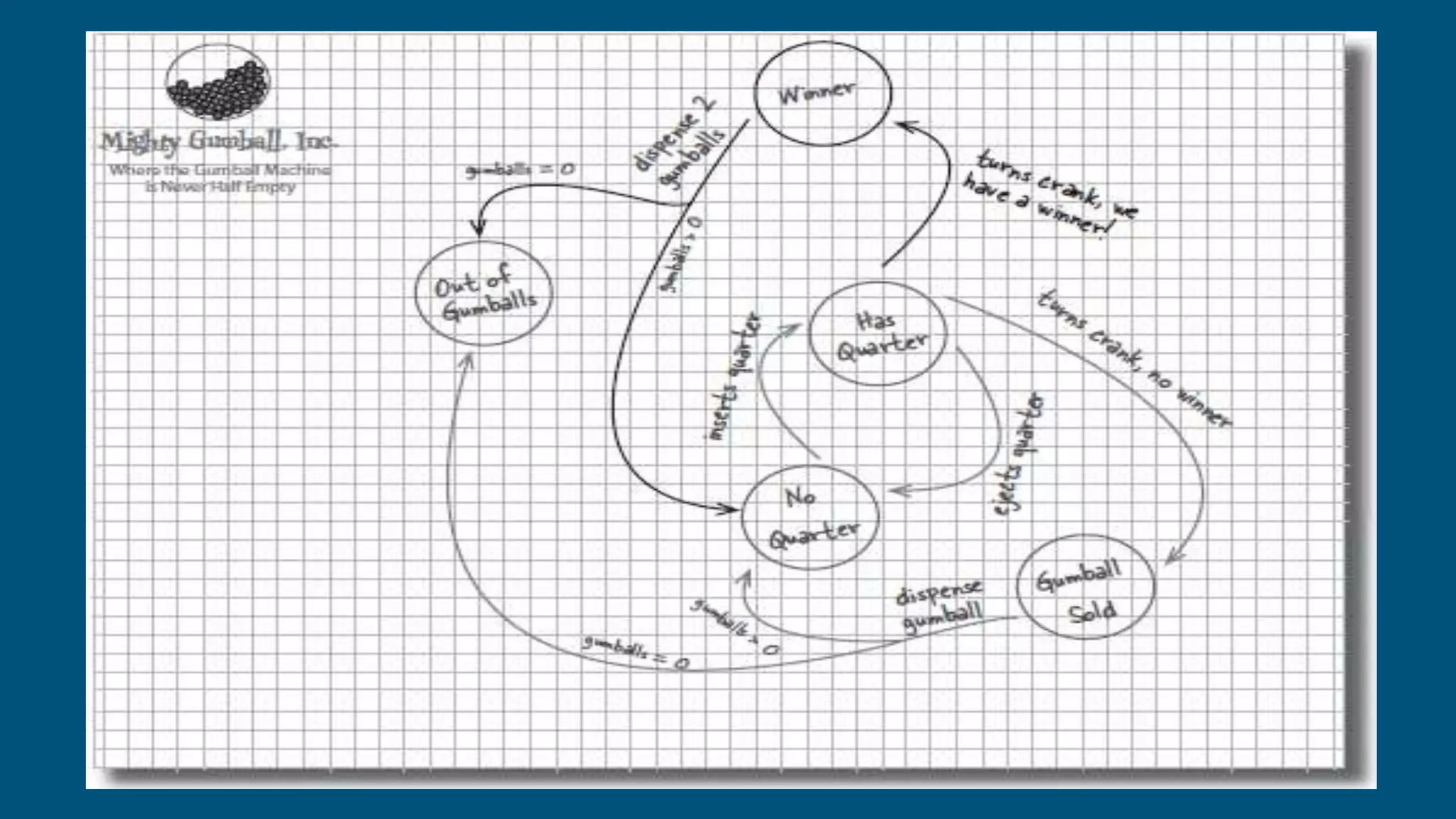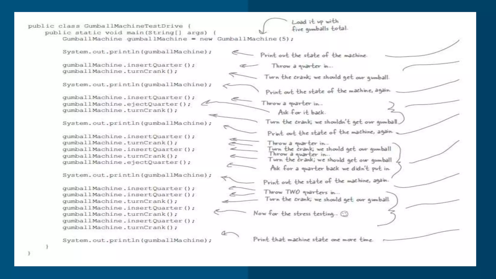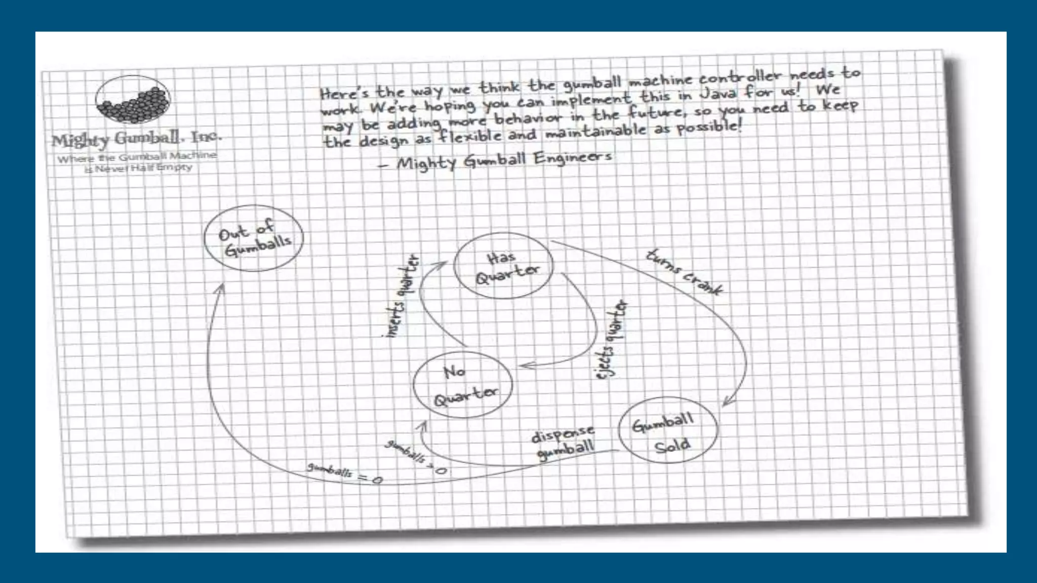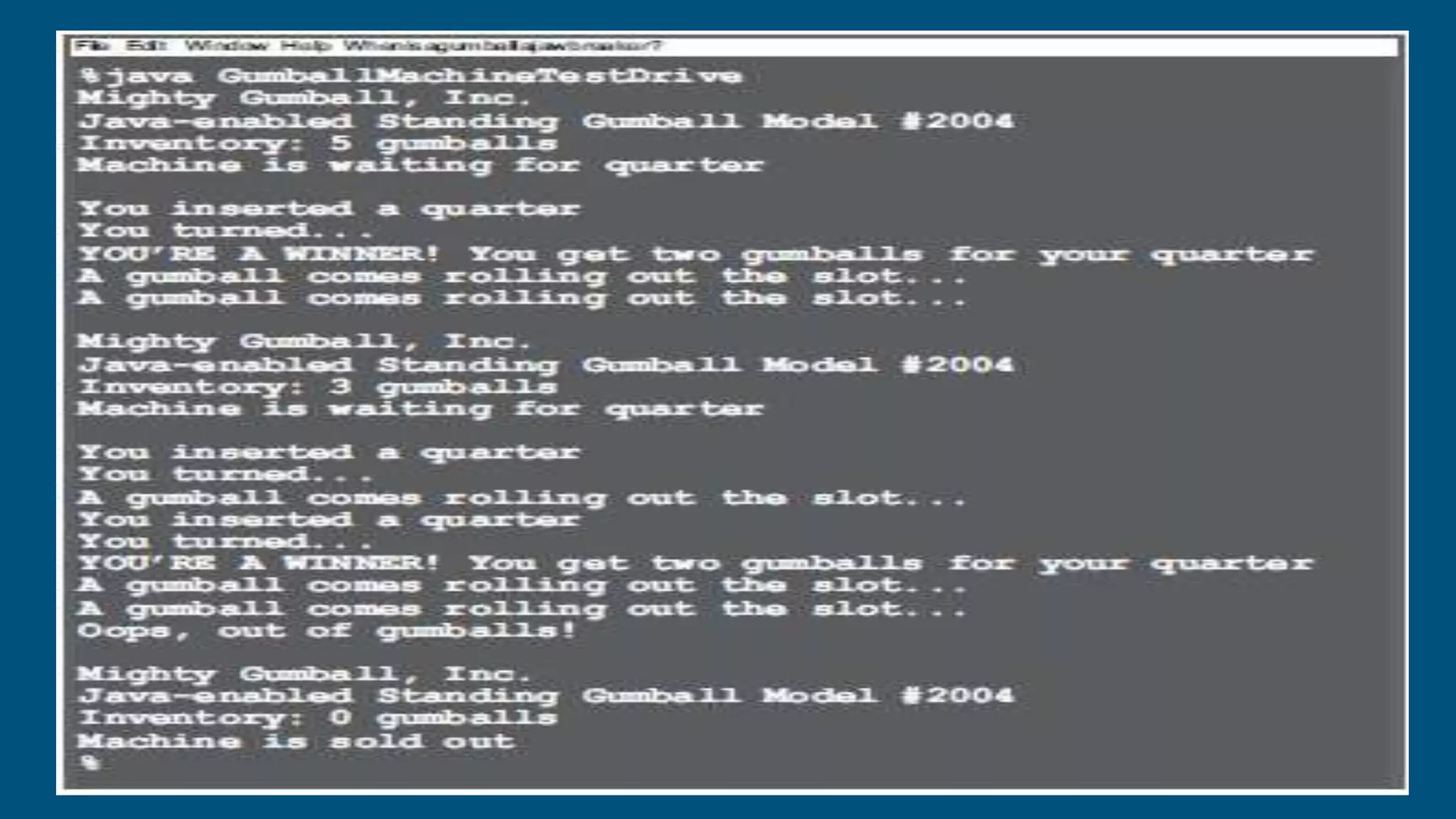 The document describes the state pattern and its implementation using a gumball machine example. The state pattern allows an object to change its behavior when its internal state changes, making it appear that the object has changed its class. The document outlines defining a State interface and implementing state classes for each machine state. It also describes reworking the Gumball Machine class to delegate to the appropriate state class and removing conditional code. This implements the state pattern and allows changing the gumball machine's behavior by changing its current state object.