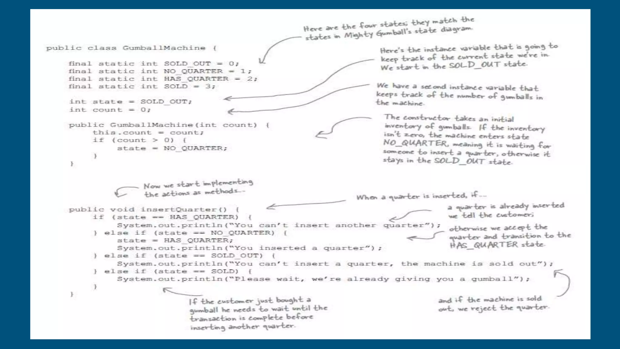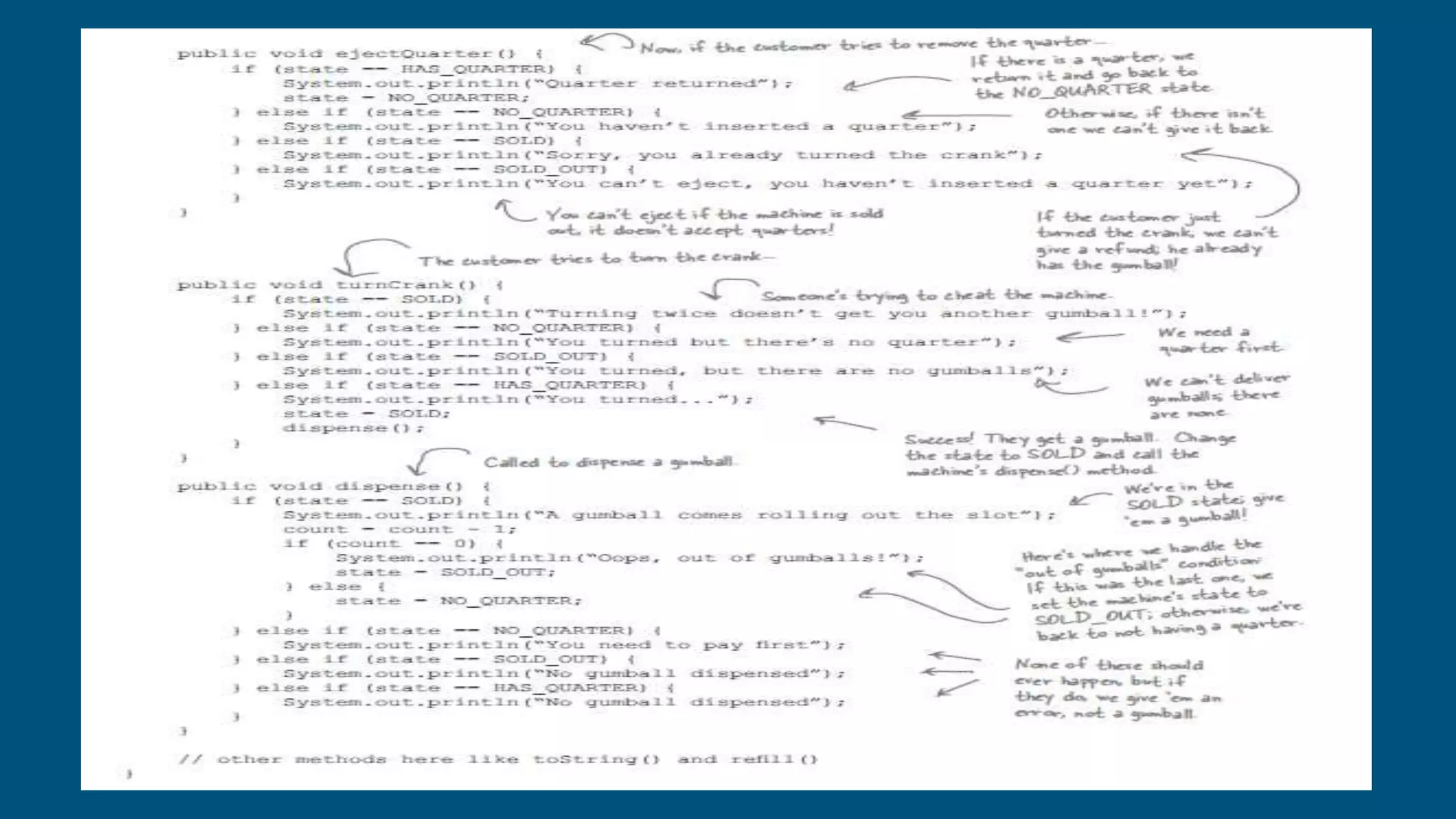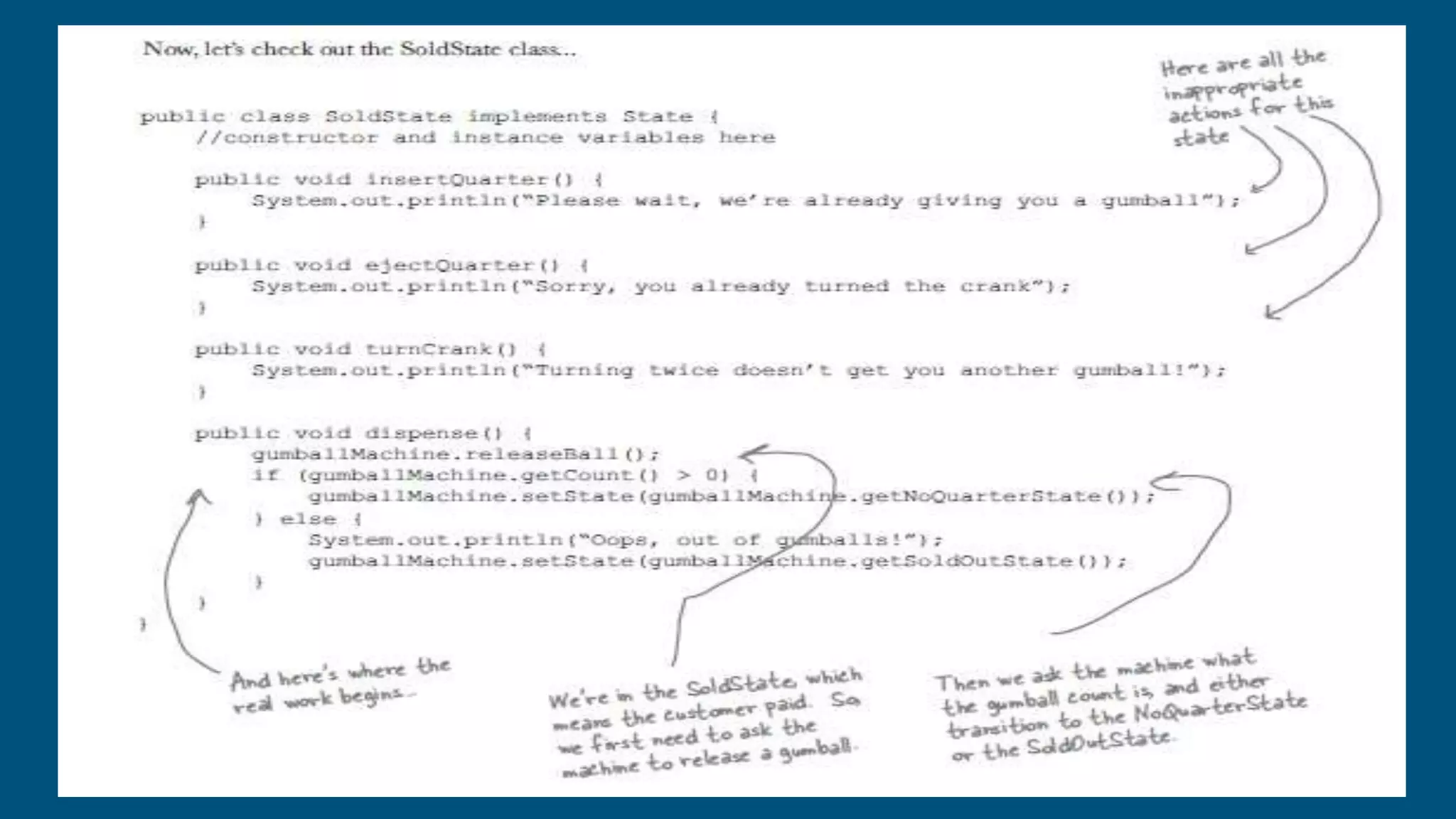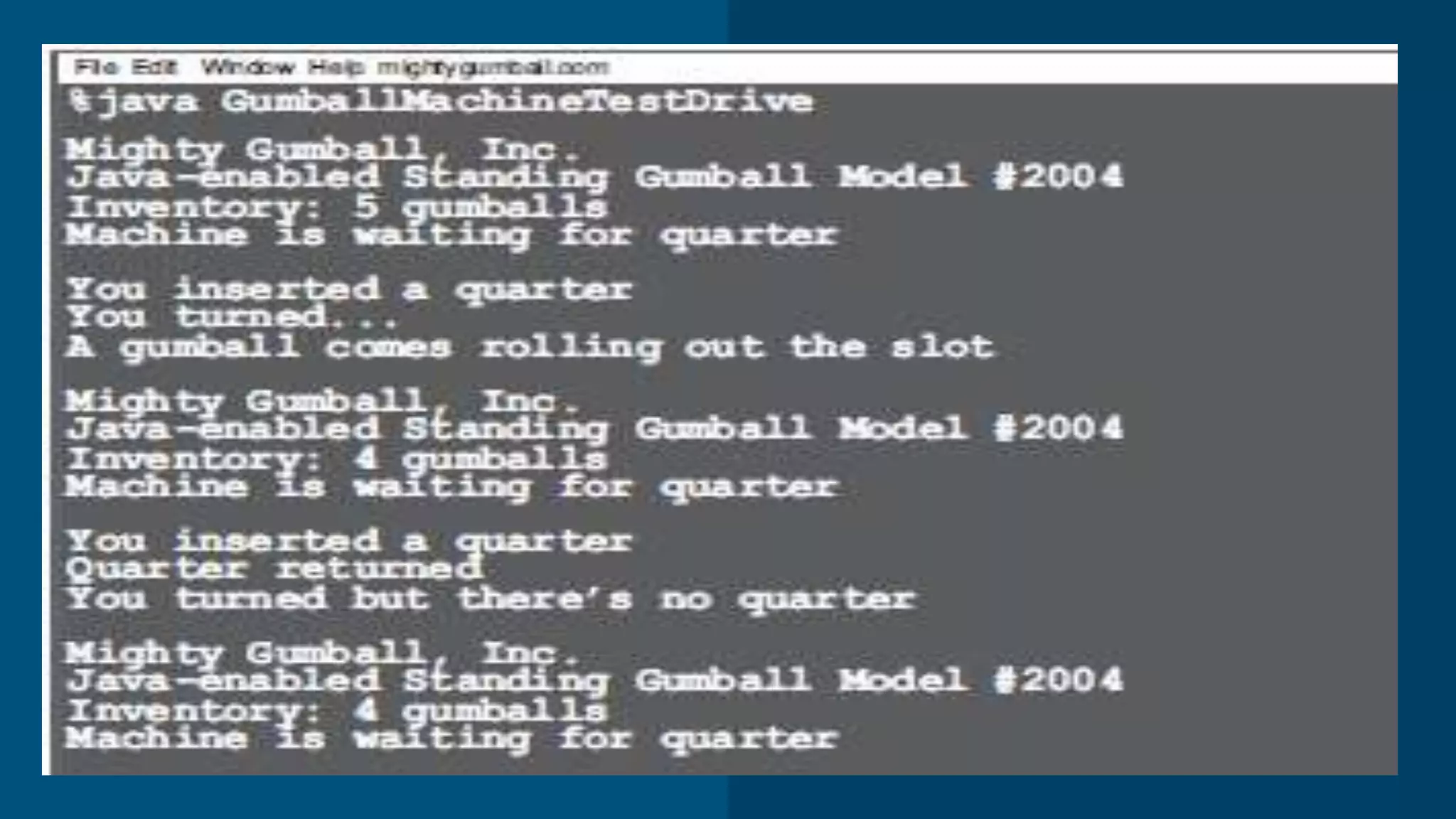 The document describes the state pattern and its implementation using a gumball machine example. The state pattern allows an object to change its behavior when its internal state changes, making it appear that the object has changed its class. The document outlines defining a State interface and implementing state classes for each machine state. It also describes reworking the Gumball Machine class to delegate to the appropriate state class and removing conditional code. This implements the state pattern and allows changing the gumball machine's behavior by changing its current state object.
