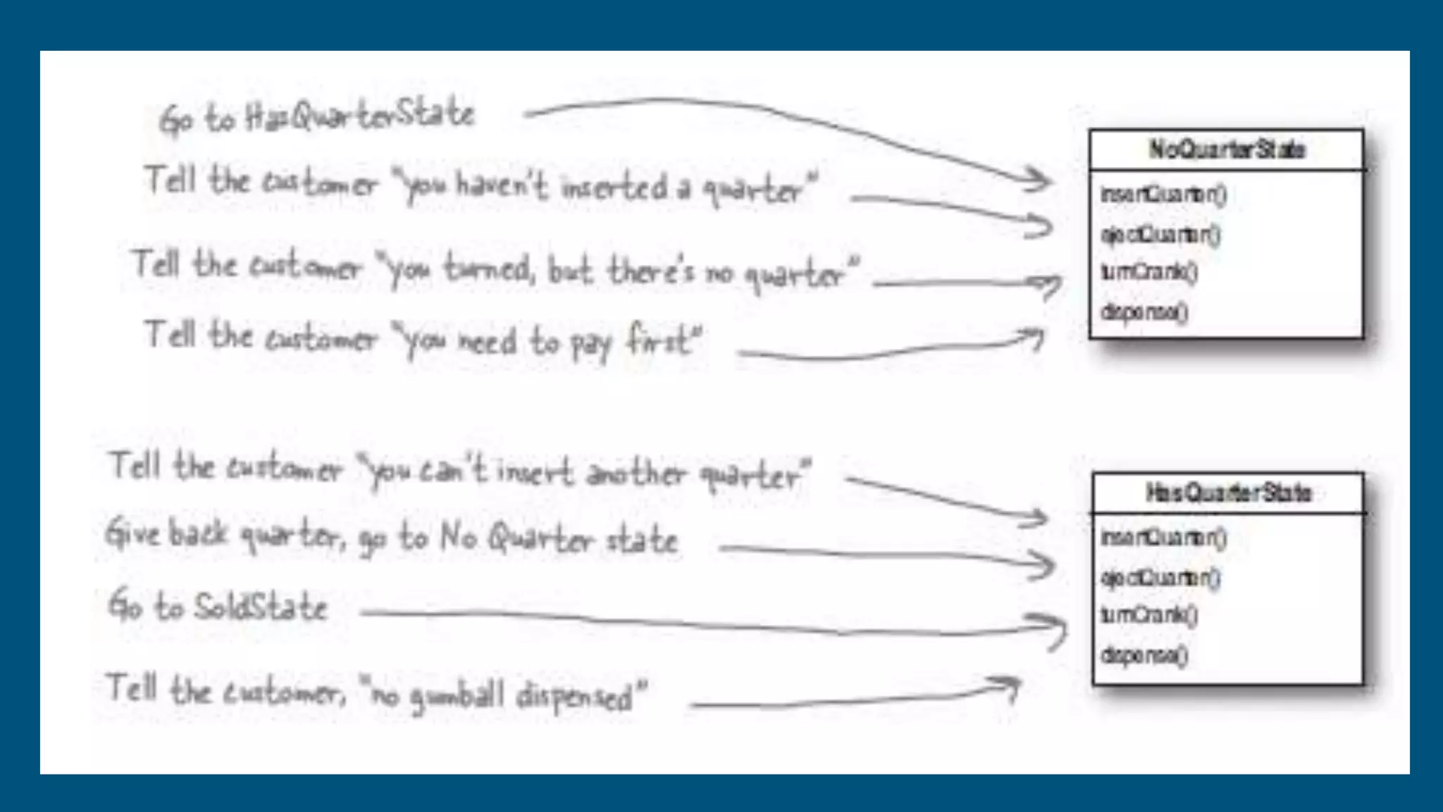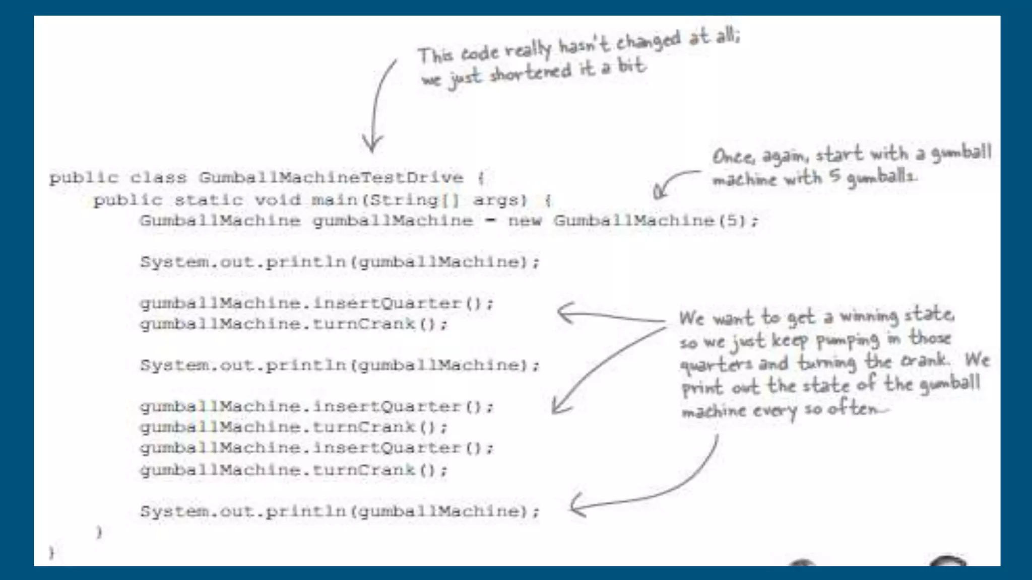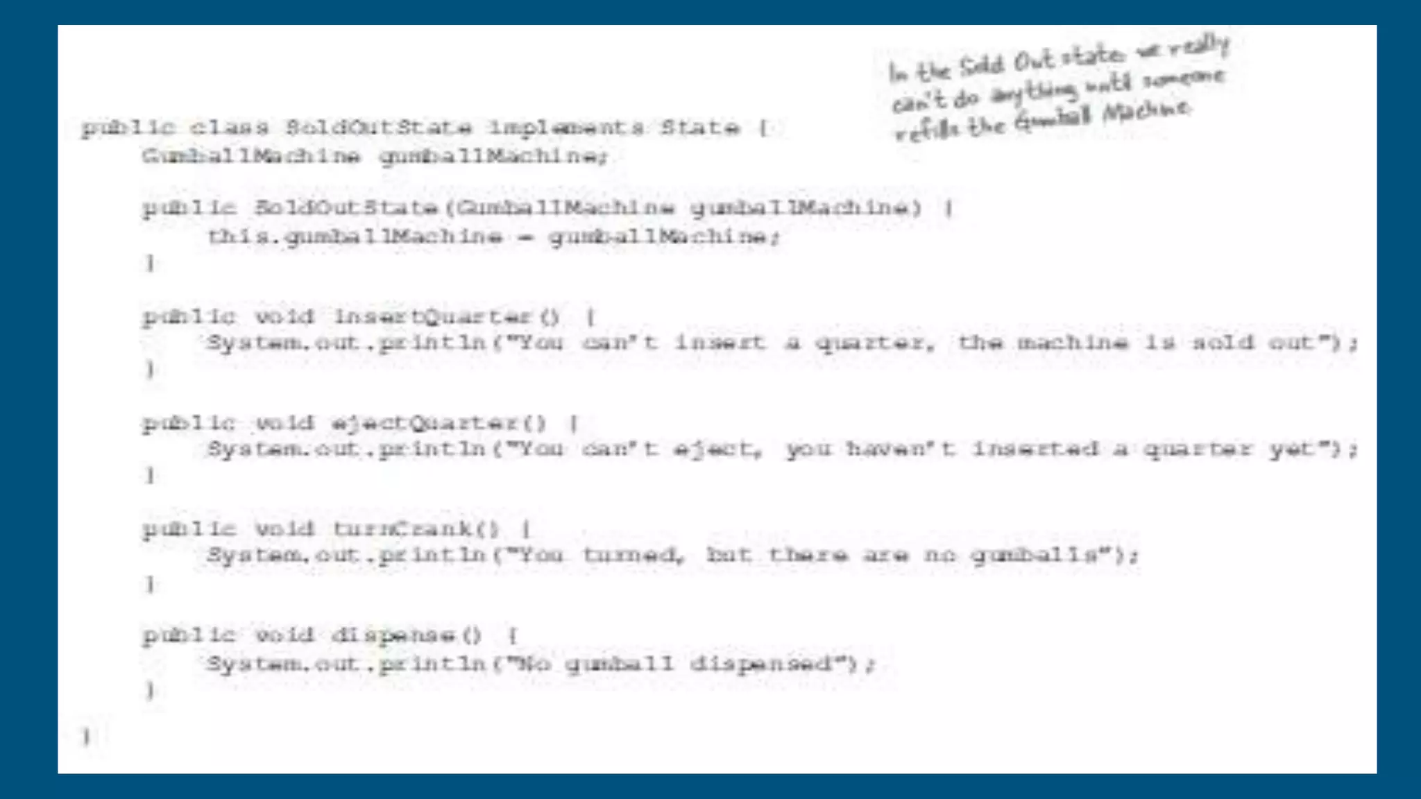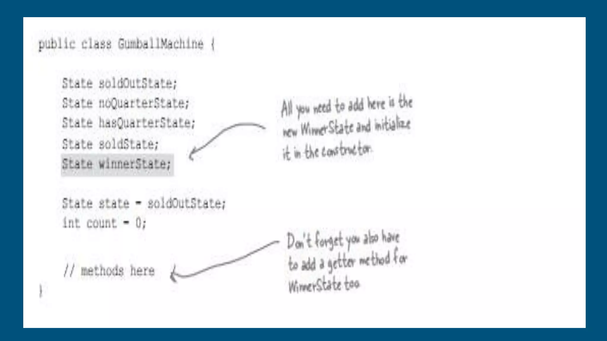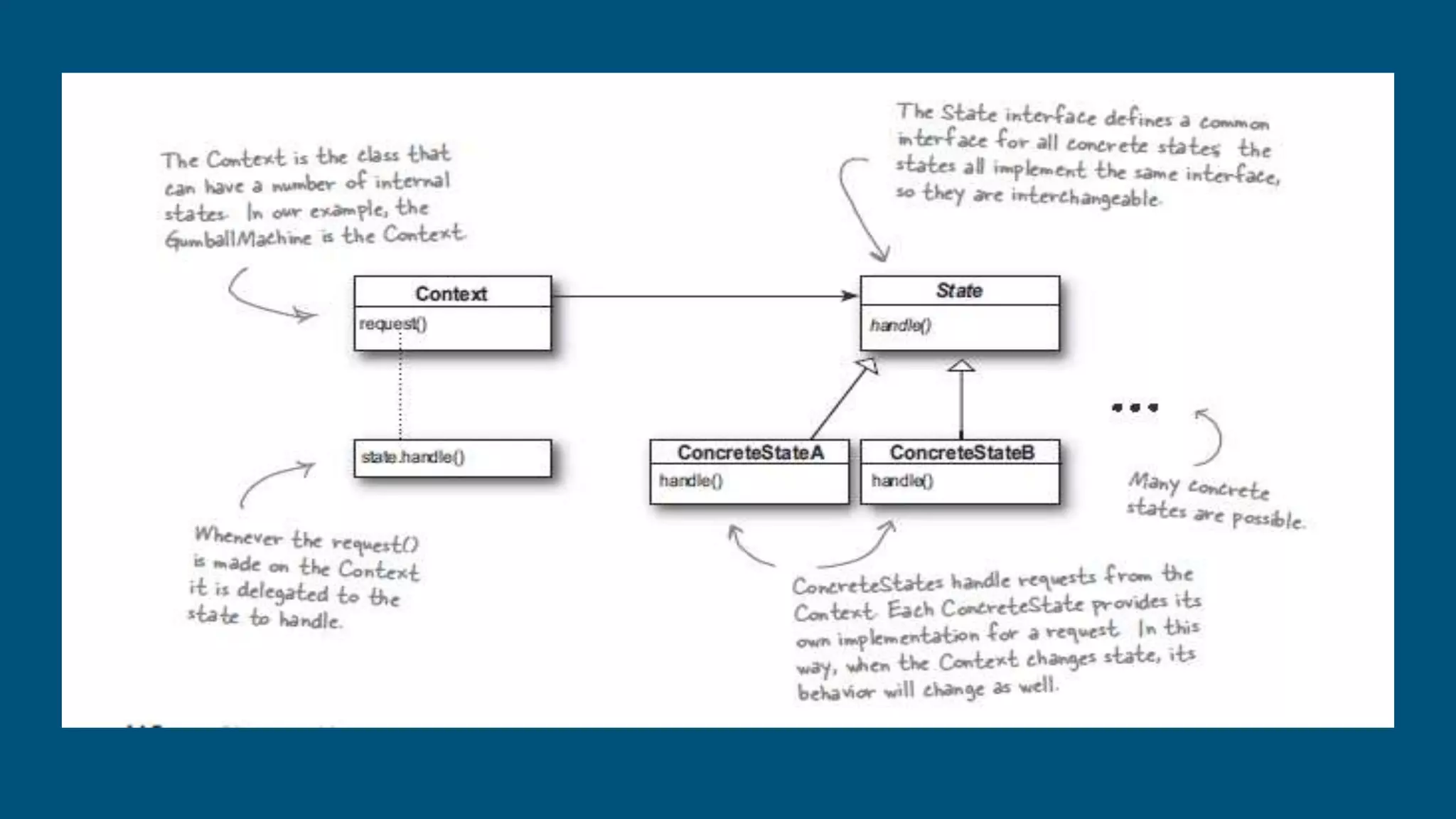 The document describes the state pattern and its implementation using a gumball machine example. The state pattern allows an object to change its behavior when its internal state changes, making it appear that the object has changed its class. The document outlines defining a State interface and implementing state classes for each machine state. It also describes reworking the Gumball Machine class to delegate to the appropriate state class and removing conditional code. This implements the state pattern and allows changing the gumball machine's behavior by changing its current state object.