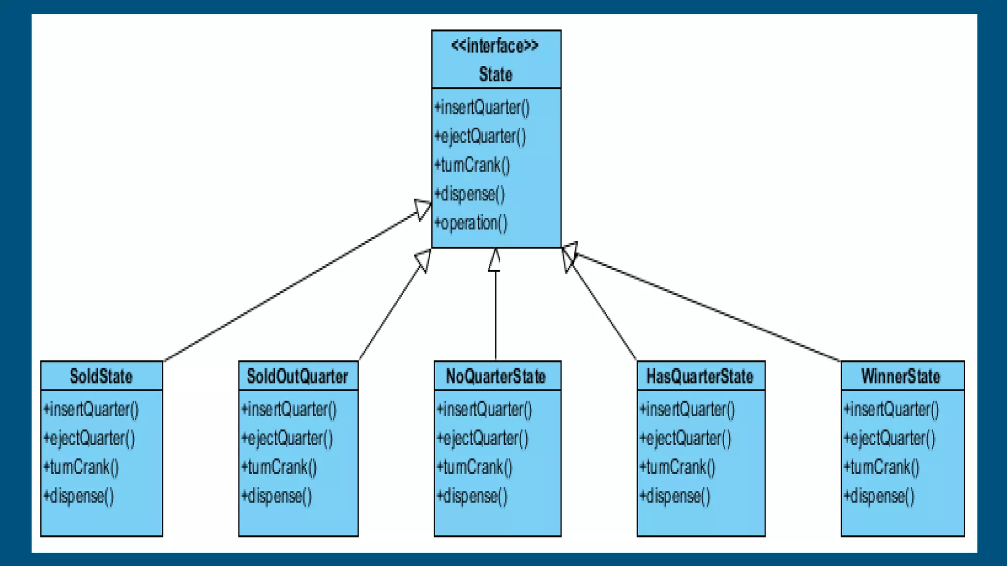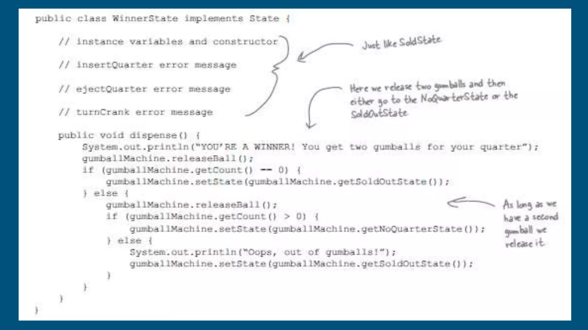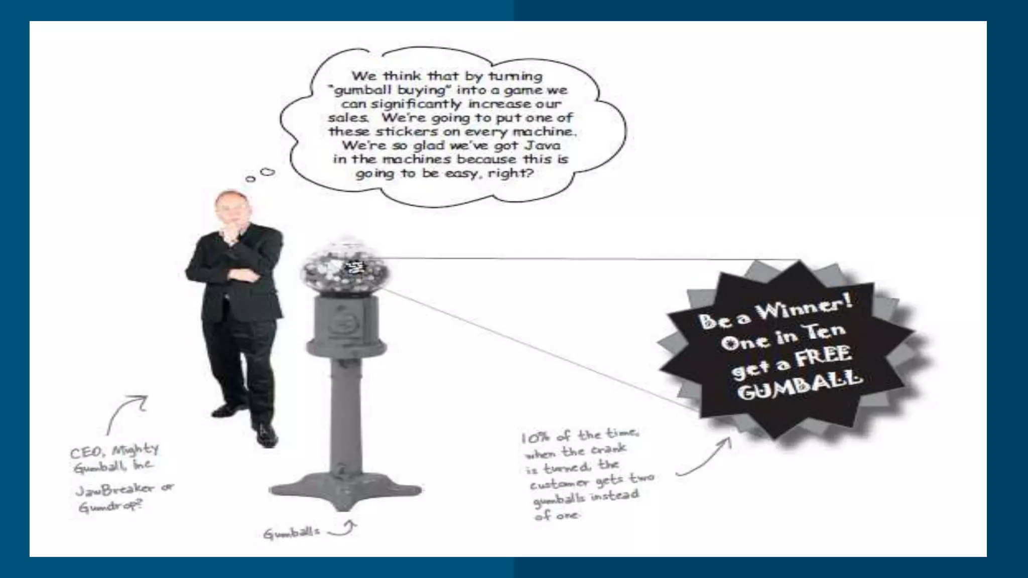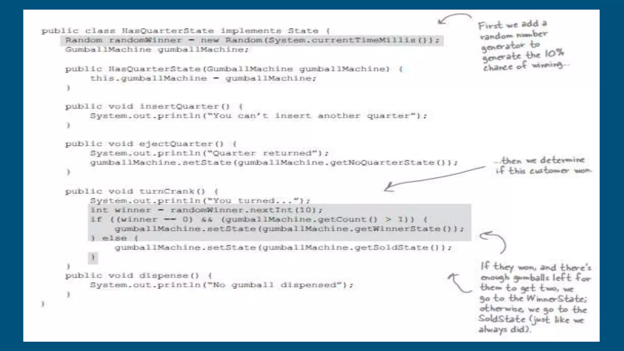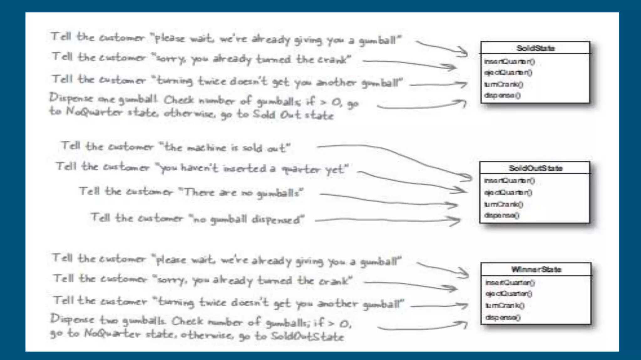 The document describes the state pattern and its implementation using a gumball machine example. The state pattern allows an object to change its behavior when its internal state changes, making it appear that the object has changed its class. The document outlines defining a State interface and implementing state classes for each machine state. It also describes reworking the Gumball Machine class to delegate to the appropriate state class and removing conditional code. This implements the state pattern and allows changing the gumball machine's behavior by changing its current state object.
