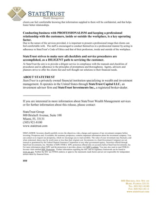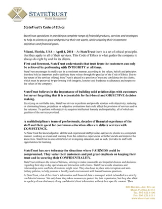StateTrust is a financial services firm that provides products and services to help clients grow and preserve their wealth while achieving financial goals. The company operates with a Code of Ethics that guides them to act with integrity, objectivity, competence, fairness, confidentiality, professionalism, and diligence. StateTrust understands that trust from customers can only be achieved through integrity in all actions. They strive for objective decision-making based on verifiable data. A team of experienced professionals allows them to deliver services competently. Fairness and confidentiality of client information are also highly valued.