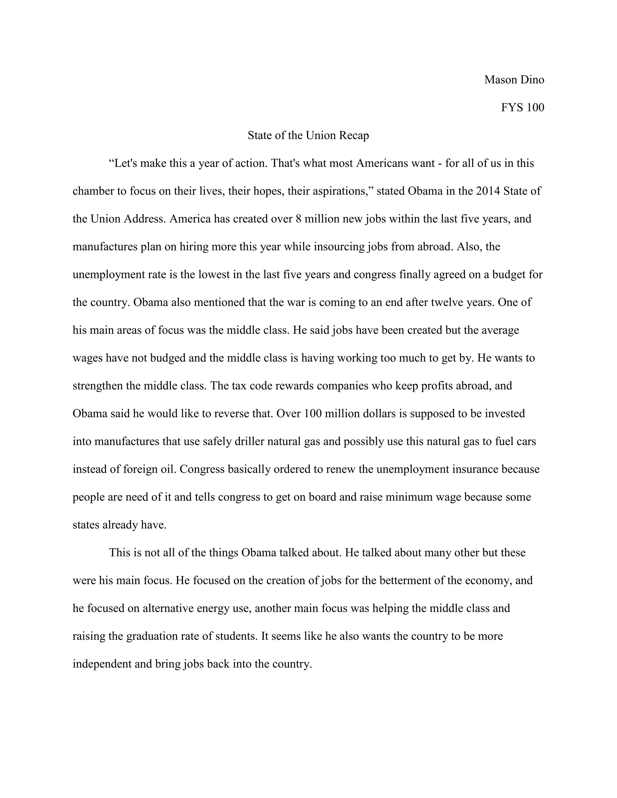 In his 2014 State of the Union address, President Obama focused on making the year one of action by Congress to help Americans. He highlighted that over 8 million new jobs have been created in the last 5 years, unemployment is at a 5-year low, and manufacturing jobs are being insourced from abroad. However, average wages have not increased and the middle class struggles. Obama called on Congress to strengthen the middle class by reforming the tax code to discourage keeping profits overseas and raising the minimum wage. He also emphasized investing in manufacturing using natural gas and fueling cars with domestic energy sources rather than foreign oil.