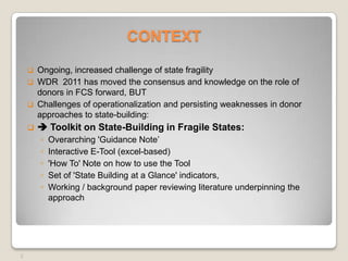 The document provides an overview of an assessment toolkit for state-building in fragile states. The toolkit includes guidance, an interactive Excel-based tool, indicators, and background papers. It aims to help donor and country teams arrive at a common understanding of state-building challenges and implications for programming.