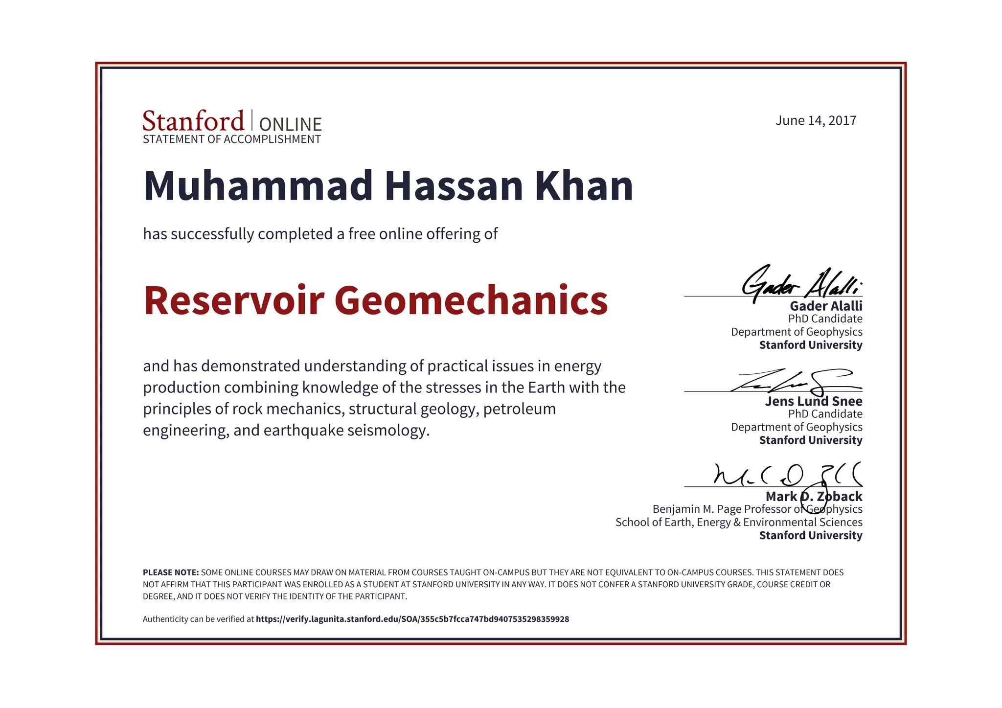 Muhammad Hassan Khan has successfully completed a free online course in reservoir geomechanics at Stanford University, demonstrating an understanding of practical energy production issues. The course integrates knowledge from various fields including rock mechanics and earthquake seismology. This statement does not equate to formal enrollment, course credit, or degree from Stanford University.