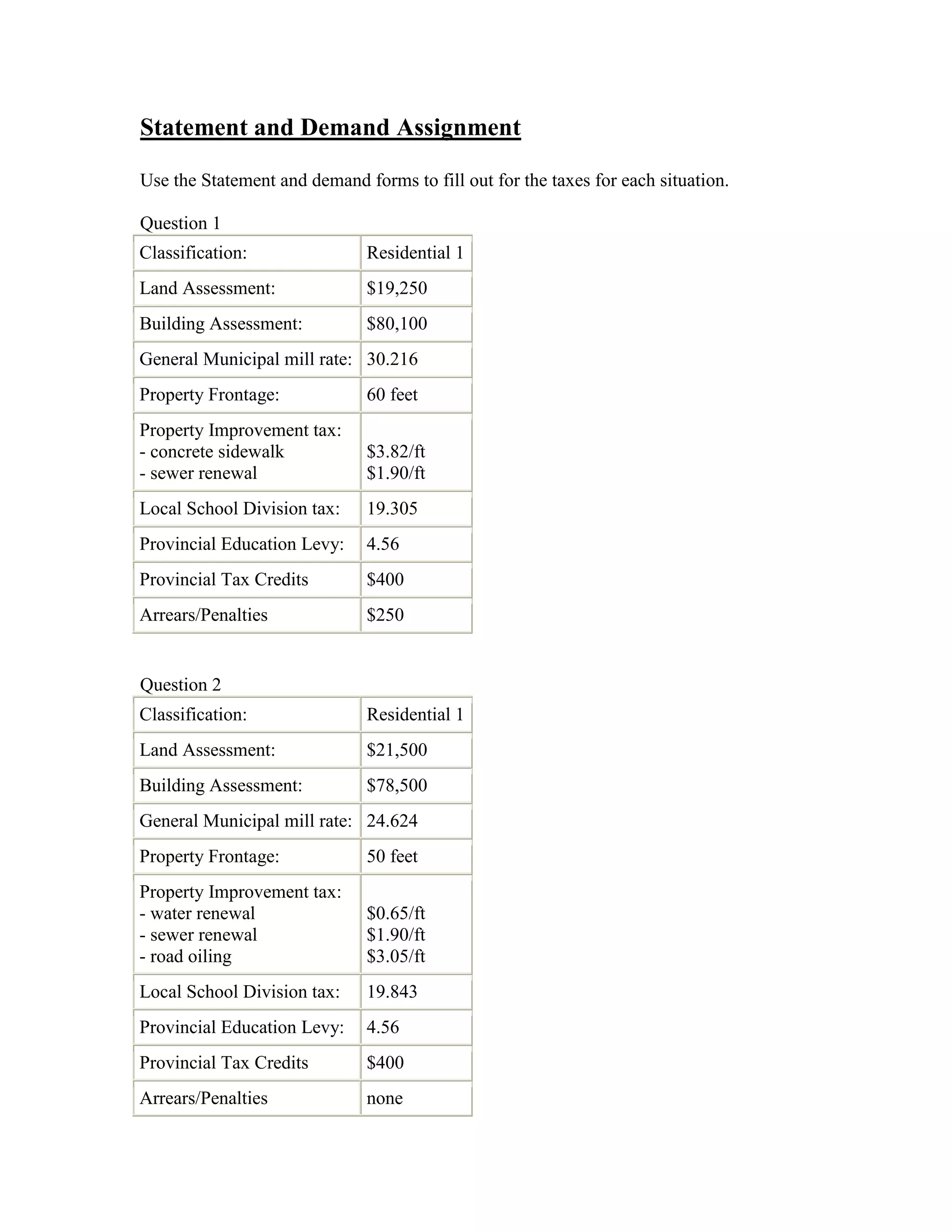 This document provides information for four tax situations including land and building assessments, mill rates, property frontages, improvement taxes, school and education levy taxes, tax credits, and penalties. The questions involve calculating statements and demands for residential properties with varying assessments, mill rates, improvement taxes, and school division taxes.