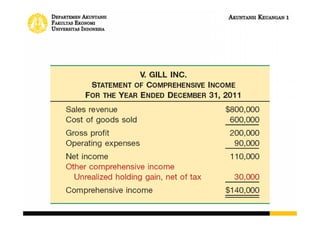 This document discusses the statement of comprehensive income. It begins by outlining the benefits and limitations of the income statement. It then describes the key elements of the income statement including revenue, expenses, gross profit, operating income, and net income. It also covers discontinued operations and how they are reported. The document concludes by explaining the statement of comprehensive income, retained earnings statement, and statement of changes in equity.