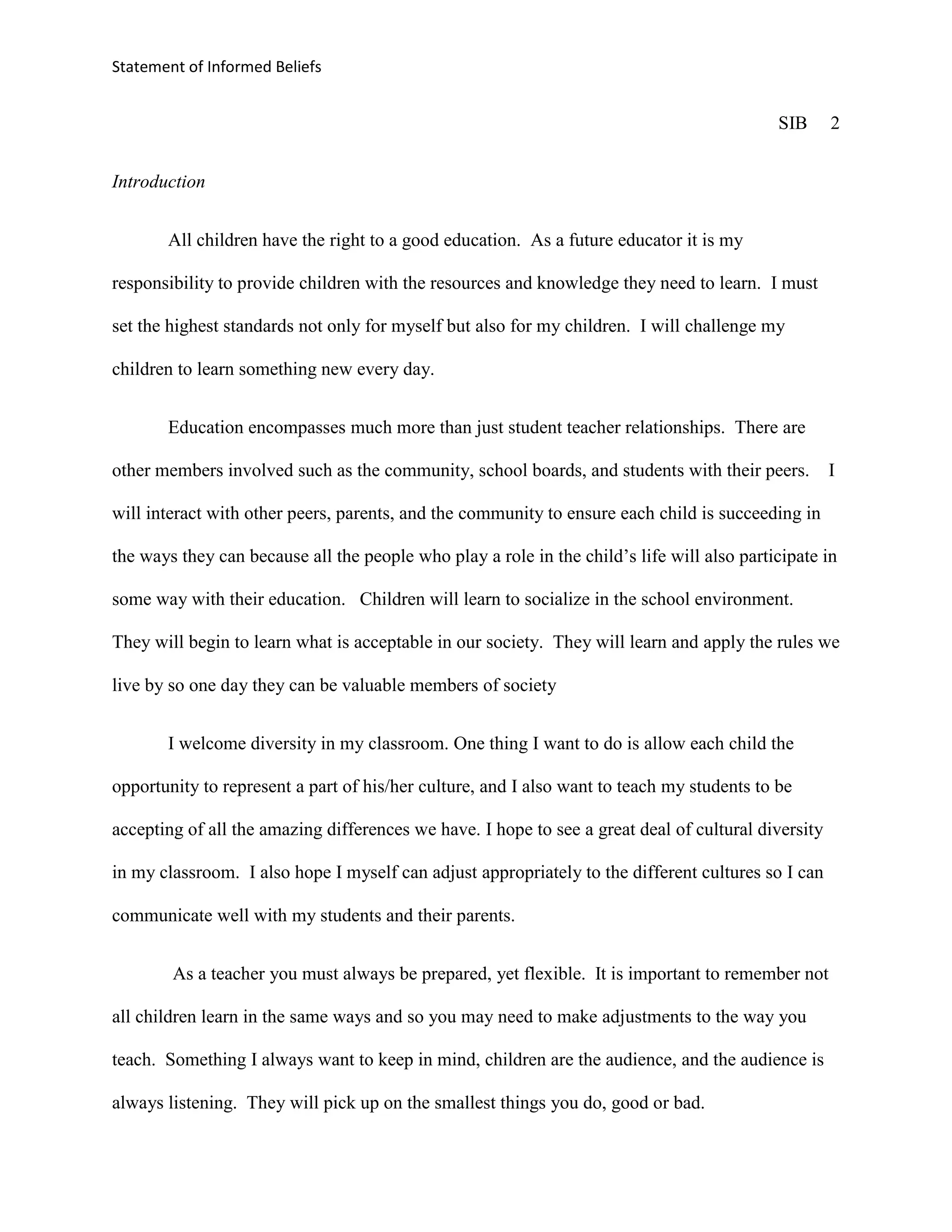 This document contains a statement of informed beliefs from Kasey Graves and Kae Hamilton about their views on education. Some of the main points discussed include: