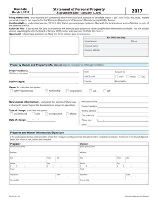 The document outlines the requirements for filing the Wisconsin Statement of Personal Property Assessment due on March 1, 2017, detailing the necessary steps for property owners to report their personal assets. It emphasizes the confidentiality of the returns, consequences of failing to file, and the various types of personal property that must be included in the assessment. Additionally, it provides guidance on reporting changes in ownership, listing different categories of property, and completing schedules for detailed asset reporting.