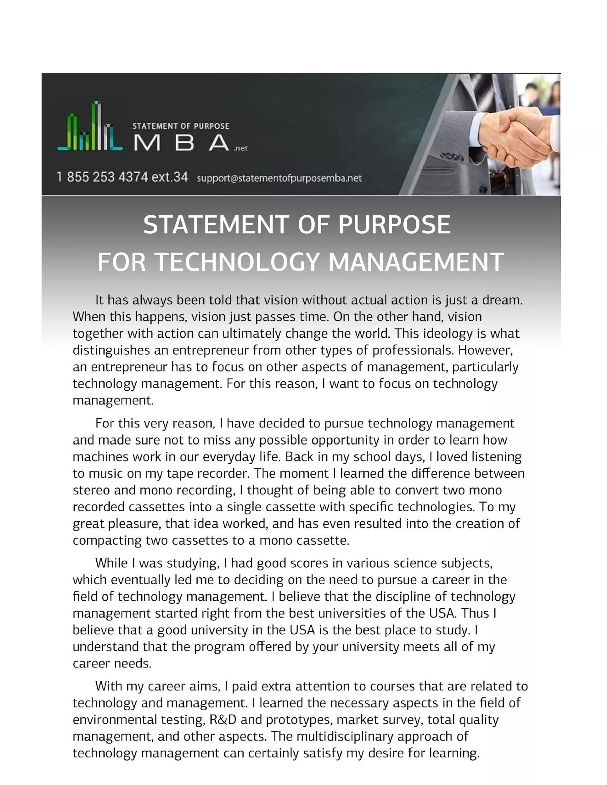 This document provides a sample statement of purpose for a technology management graduate program. It offers an example SoP that demonstrates the applicant's qualifications and interest in technology management. The document includes a link to access the full sample statement of purpose for technology management on an online website.