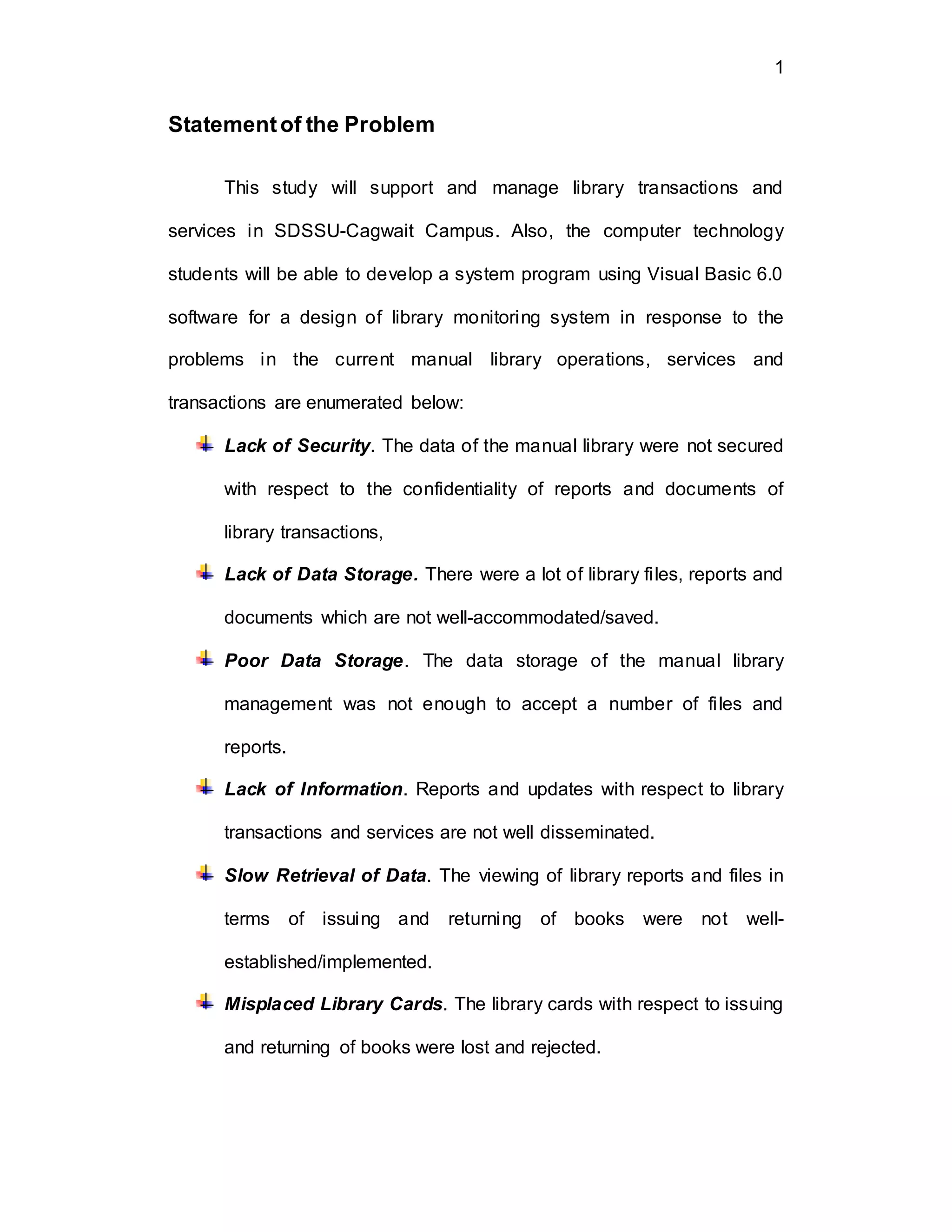 The document outlines problems with the current manual library management system at SDSSU-Cagwait Campus, including lack of security and data storage, slow retrieval of information, and misplaced or lost library cards and books. It then states that the objectives of developing a new library monitoring system using Visual Basic 6.0 are to perform library services and transactions more efficiently, promote faster retrieval of information about books, and reduce paperwork while providing secure data storage and supporting day-to-day library operations and management.