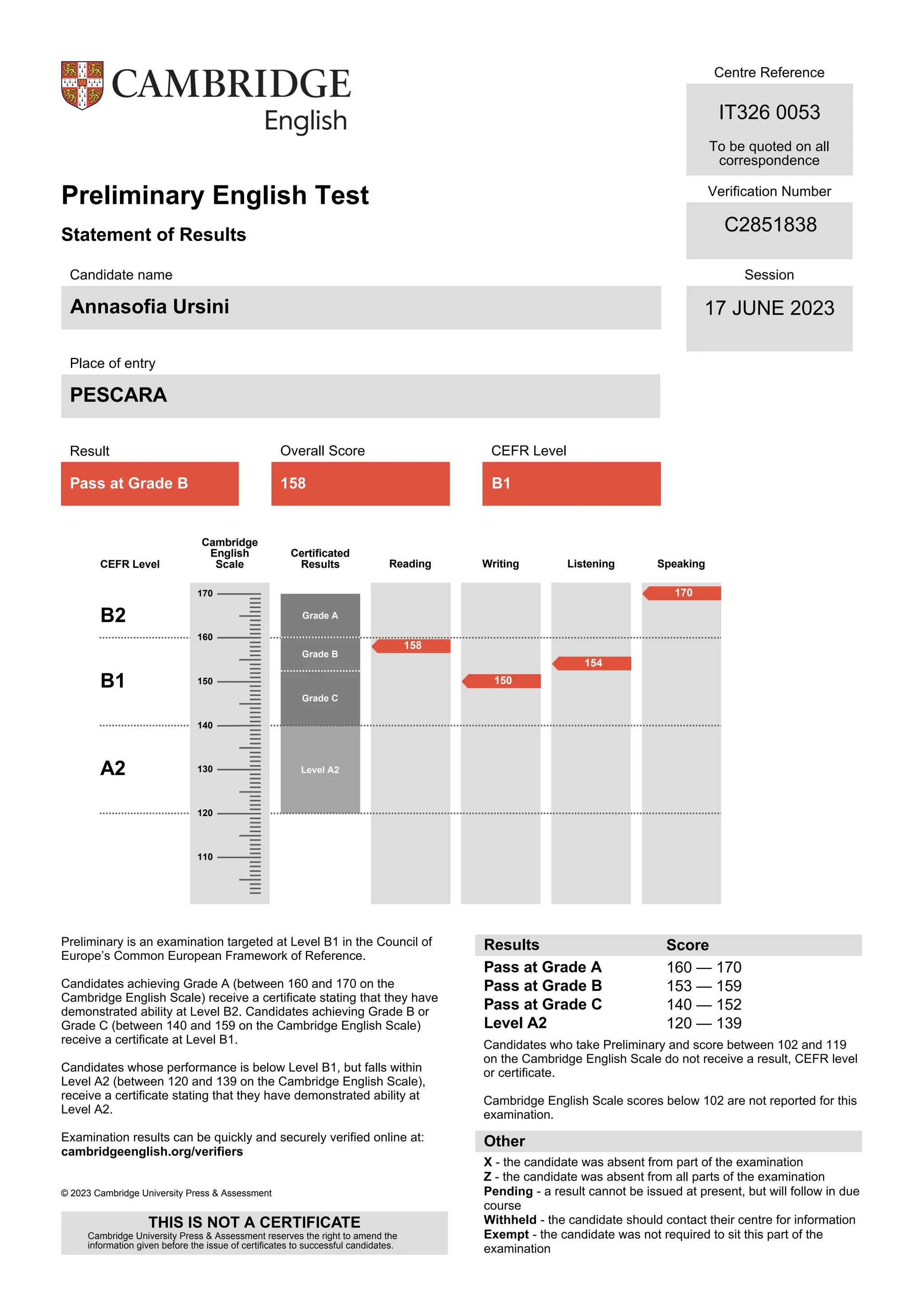 be quoted on all correspondence Preliminary English Test Statement of Results Candidate name Annasofia Ursini Place of entry PESCARA Session 17 JUNE 2023 Result Pass at Grade B Overall Score 158 CEFR Level B1 CEFR Level Cambridge English Scale Certificated Results B2 B1 A2 Grade A Grade B Grade C Level A2 Preliminary is an examination targeted at Level B1 in the Council of Europe’s Common European Framework of Reference. Candidates achieving Grade A (between 160 and 170 on the Cambridge English Scale) receive a certificate stating that they have demonstrated ability at Level B2. Candidates achieving Grade B or Grade C (between 140 and 159 on the Cambridge English Scale) receive a certificate at Level B1. Candidates whose performance is below Level B1, but falls within Level A2 (between 120 and 139 on the Cambridge English Scale), receive a certificate stating that they have demonstrated ability at Level A2. Examination results can be quickly and securely verified online at: cambridgeenglish.org/verifiers THIS IS NOT A CERTIFICATE Cambridge University Press & Assessment reserves the right to amend the information given before the issue of certificates to successful candidates. Results Score Pass at Grade A Pass at Grade B Pass at Grade C Level A2 160 — 170 153 — 159 140 — 152 120 — 139 Candidates who take Preliminary and score between 102 and 119 on the Cambridge English Scale do not receive a result, CEFR level or certificate. Cambridge English Scale scores below 102 are not reported for this examination. Other X - the candidate was absent from part of the examination Z - the candidate was absent from all parts of the examination Pending - a result cannot be issued at present, but will follow in due course Withheld - the candidate should contact their centre for information Exempt - the candidate was not required to sit this part of the examination 170 160 150 140 130 120 110 Reading 158 Writing 150 Listening 154 Speaking 170 Verification Number C2851838 © 2023 Cambridge University Press & Assessment