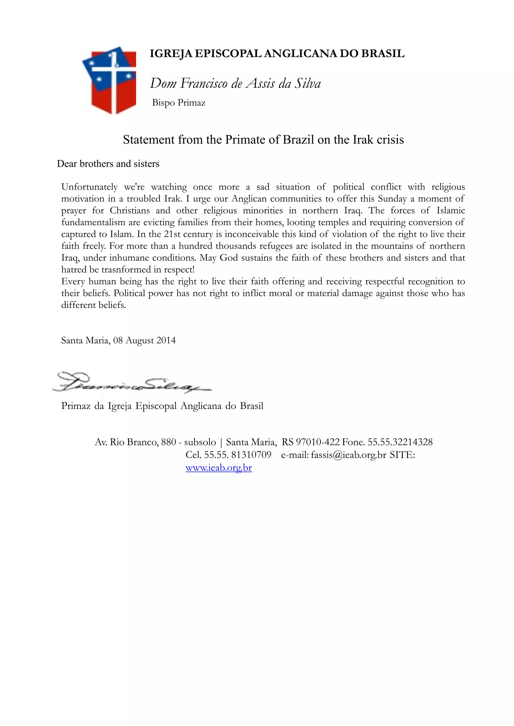 The Primate of Brazil urges Anglican communities to pray for Christians and other religious minorities in northern Iraq who are facing persecution by Islamic fundamentalist forces. Over 100,000 refugees have been forced from their homes and are living in inhumane conditions in the mountains, and temples have been looted with people being forced to convert to Islam. The Primate states that every person has the right to freely live out their faith without fear of harm or conversion, and that political powers should not inflict damage on people due to their religious beliefs.