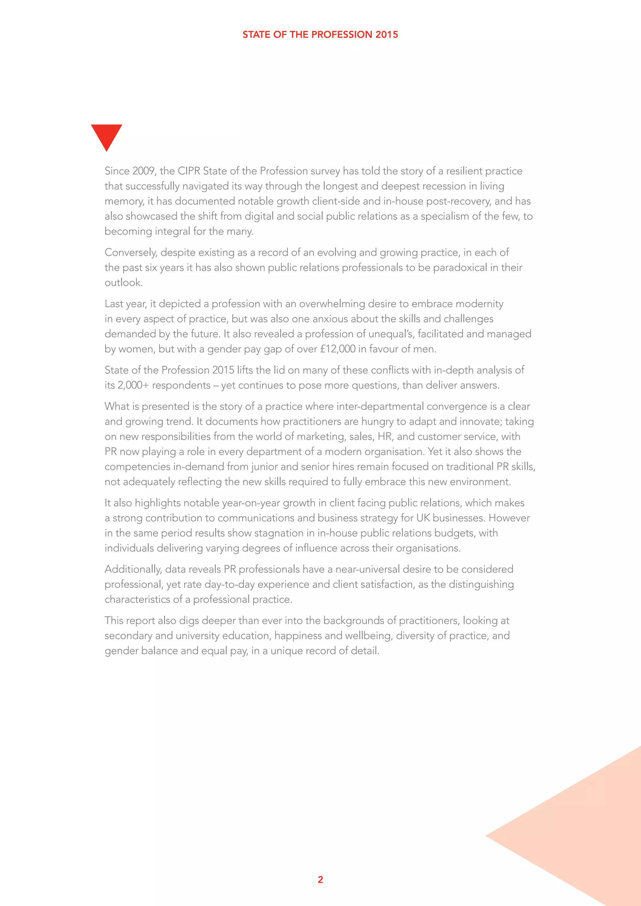 The 2015 CIPR State of the Profession report highlights an evolving public relations landscape characterized by inter-departmental convergence and an increasing demand for digital skills, while revealing significant challenges related to gender pay disparity and traditional skill gaps. Despite high job satisfaction among practitioners, the report points to rising stress levels, particularly among senior professionals, and indicates a need for improved diversity and inclusion within the industry. The findings underscore the necessity for PR professionals to embrace change and modernize their practices to meet the demands of a shifting business environment.