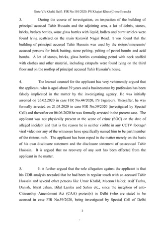 1) The document discusses the bail application of Khalid Saifi who has been charged under various sections related to rioting, criminal conspiracy, and unlawful assembly in connection with the February 2020 riots in Delhi.