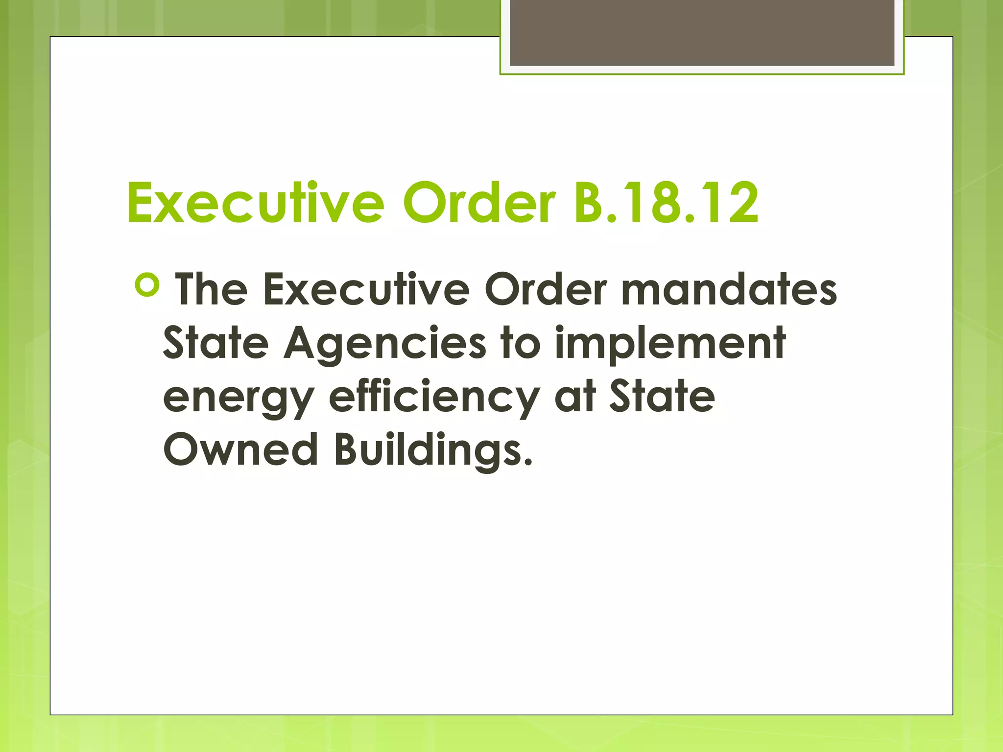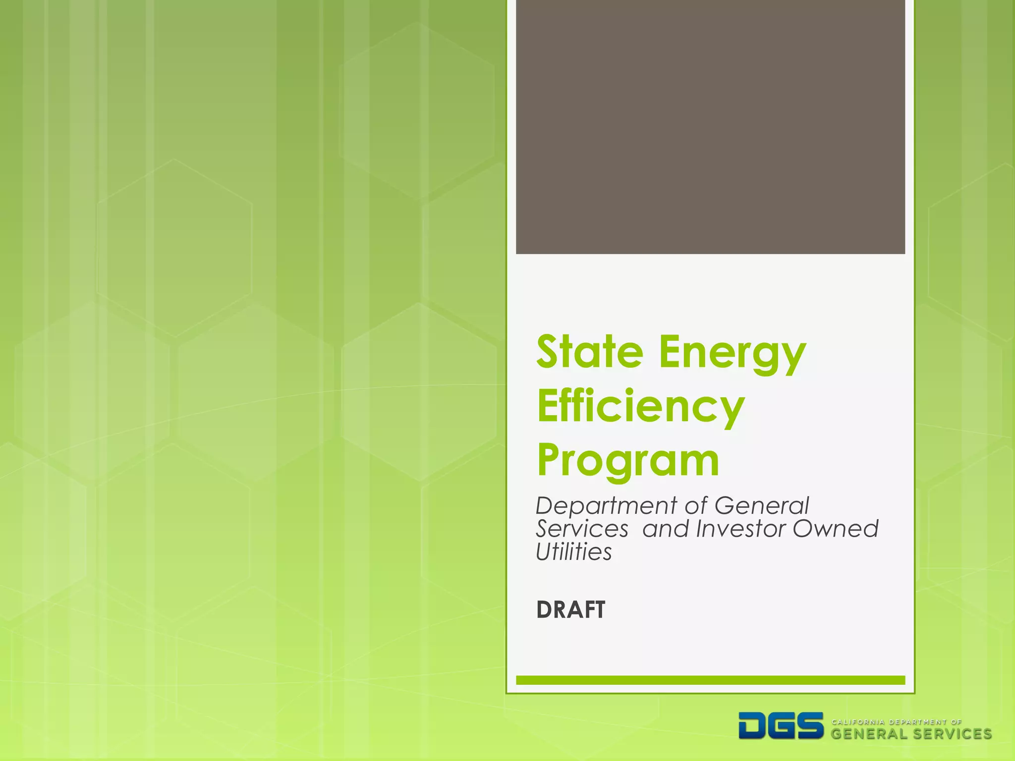 The document summarizes a State Energy Efficiency Program managed by the Department of General Services to help state agencies meet the goals of Executive Order B.18.12 to implement energy efficiency in state-owned buildings. The program identifies energy efficiency projects using pre-qualified Energy Service Companies, guarantees energy savings through energy savings performance contracts, and finances projects through funding sources like the DGS revolving fund with no upfront budget impact to agencies. It provides details on the audit process, types of incentives available from investor-owned utilities, example project sites, and the role of Energy Service Companies to develop and guarantee savings from projects.